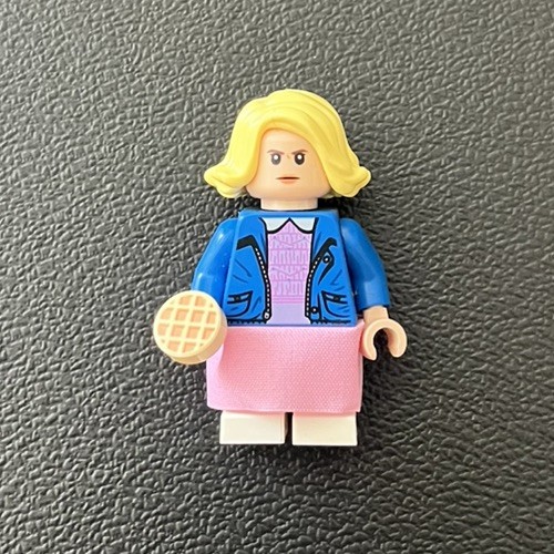 LEGO minifigure of Eleven from the Stranger Things theme, specifically from set 75810 The Upside Down House. This collectible item is made of plastic and was manufactured in 2019. It is part of the LEGO brand and falls under the LEGO Stranger Things subtheme. The minifigure includes a waffle accessory and is designed to be a detailed representation of the character. This retired piece was released in 2019 and is no longer in production, making it a sought-after item for LEGO enthusiasts and fans of the popular TV show.