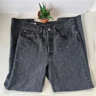 Absolutely love these Levi's 501 bling jeans! The black wash with silver studs and crystals adds the perfect amount of sparkle without being too flashy. The fit is classic high-rise with just the right amount of stretch—super comfortable and flattering. Great pre-owned condition, and the button fly gives them an authentic vintage feel. Perfect for dressing up or keeping it casual. Super unique find!