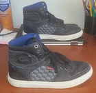 The shoes are Levi's Mason Hi sneakers, which are ideal for men who want to have a comfortable and stylish pair of shoes. These sneakers are available in blue color and have an upper material of canvas, while the outsole material is made of rubber. With a lace-up closure, these shoes are perfect for casual wear. The shoe width is M, the insole material is foam, and the product line is Nike Free. These shoes are available in UK shoe size 7, US shoe size 8, and EU shoe size 41. These sneakers feature a high-top design and solid pattern, making them an excellent choice for sneaker enthusiasts. The royal theme and blue color make them perfect for wearing with different outfits, while the shoe shaft style is perfect for those who want to make a statement with their footwear. They are men's shoes and great for athletic activities. The shoes are suitable for people who love comfortable and stylish sneakers and can be a great addition to their wardrobe.