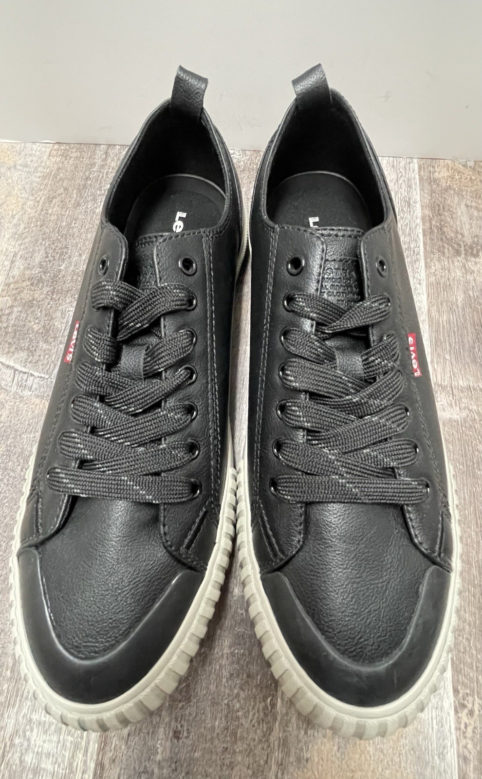 The product is a pair of Levi's Anikin sneakers in men's size 9, featuring a black and gray color scheme with a solid pattern. These lace-up sneakers have a round toe shape and are designed for casual occasions, offering comfort for year-round wear. Made with synthetic upper material and a comfortable M width, these shoes are a brand new addition to the Levi's collection.