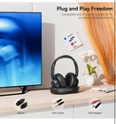 Private Watching Experience: LEVN wireless Headphones for TV are designed to provide a private, comfortable home entertainment experience to make your TV time more enjoyable. When you want to watch a midnight movie at home, you can not only immerse yourself in the plot but also protect your family's sweet dreams. This tv headphones wireless is also great for people with hearing impairments, who can easily adjust the volume and enjoy clear sound without disturbing family or neighbors. Low Latency Audio: Our TV headphones wireless feature Bluetooth 5.2 technology and offer ultra-low latency of <40ms. Watch football matches with our TV headphones, which feature the perfect combination of lip reading and audio, and experience every exciting moment in real-time. Our headphones for tv have a connection range of up to 30M/100FT, even if you want to grab a beer from the fridge to celebrate, you don't have to worry about your audio dropping out because your audio always follows you. Plug and Play: Simply plug the audio cables into the ports on the transmitter and TV and power on everything to start using your wireless TV headphones. There is no need for complicated Bluetooth pairing steps, this is ideal for users looking for a simple, enjoyable TV viewing experience. Our wireless headphones are equipped with 3 audio cables: optical, AUX 3.5mm, and RCA. If your TV does not have the above port, it can also connect to the headphones via Bluetooth. Giving you more choices. Reliable Companion: Experience unwavering reliability with our wireless headphones for TV that last up to 65 hours on a single charge. You can enjoy movie marathons at any time, letting every plot twist unfold uninterrupted without worrying about running out of battery. After using the TV headphones wireless, there is no need to worry about its placement, just place it on the TV transmitter to quickly replenish energy. No cables, no hassle, get ready for your next audio journey! Comfortable and Warm: The earmuffs of the Bluetooth headphones for TV are made of high-quality protein leather and breathable cotton, which provide continuous comfort even if you wear them all day long. It's perfect as a warm gift to express your love for your family. And we also have a professional team to answer questions online at any time and provide one-on-one service, so that you or your family can feel caring and caring during use, making TV entertainment more personalized and enjoyable.