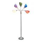 Silver metal base 5 x plastic shades (white, blue, purple, green, red) Available light settings: 2 lights on 3 lights on 5 lights on Off Rotary switch located on pole for convenience Uses 5 x 60W equivalent Type A medium base bulbs (not included)