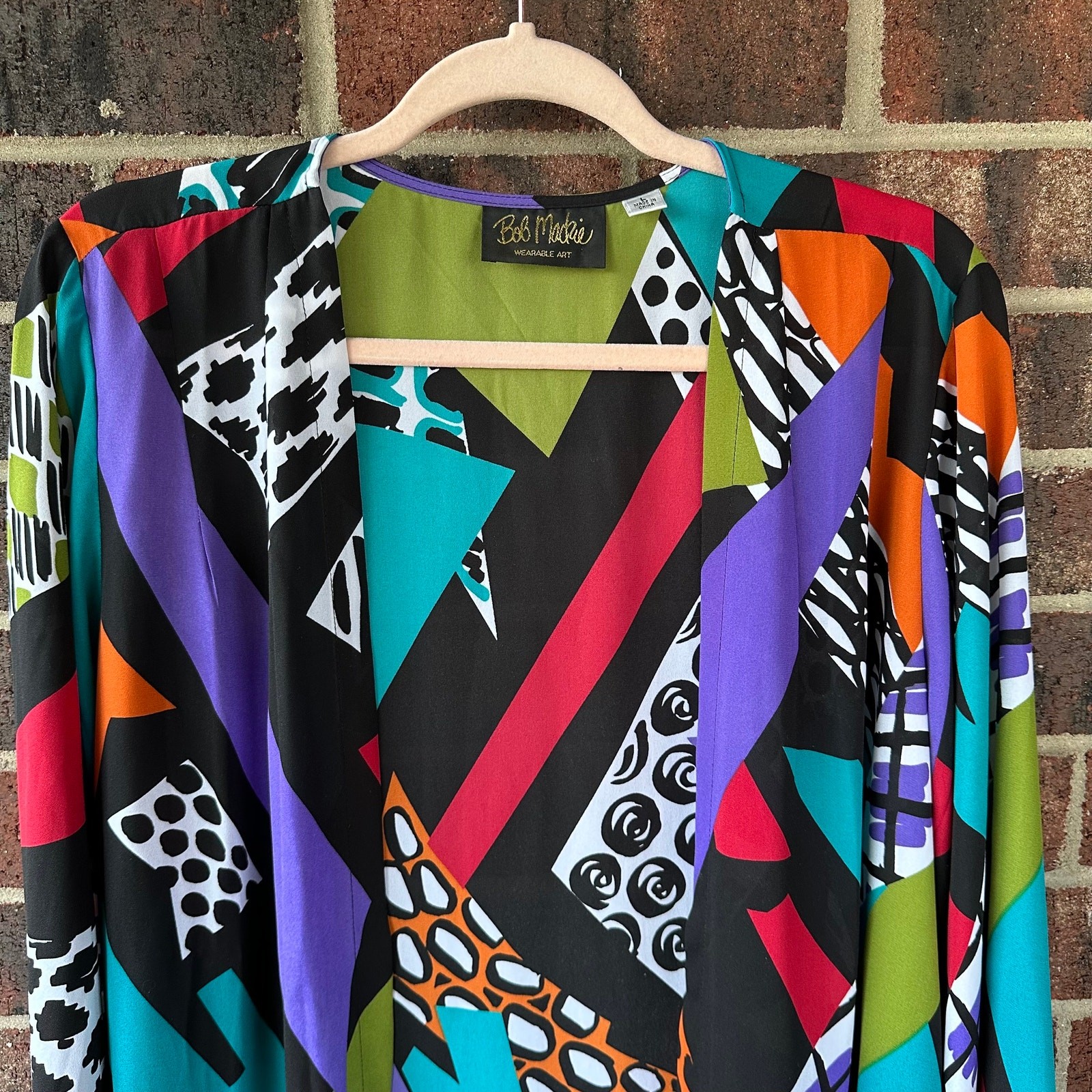 Make a bold & unforgettable statement in this Bob Mackie Wearable Art kimono, a true piece of designer fashion history. This stunning size Large duster-style robe features Mackie’s signature abstract, painterly print in vibrant jewel tones & flowing lines. With an open front, draped silhouette, & wide sleeves, this piece embodies art-to-wear luxury. Perfect as a layering piece over basics or worn as a lightweight statement jacket, it’s ideal for lovers of vintage designer fashion, boho glam, & avant-garde style. Whether you’re collecting or styling, this kimono elevates any wardrobe. Bob Mackie Wearable Art Large Approx. measurements: pit to pit- 24" Length- 30" Sleeve- 19" Fit: Flowy, open-front kimono Abstract / painterly / artistic Colors: Multicolor (blues, purples, reds, neutrals) Fabric: Lightweight poly blend Condition: Excellent pre-owned A rare piece of vintage wearable art from an iconic designer known for bold prints, theatrical flair, & red carpet glam.