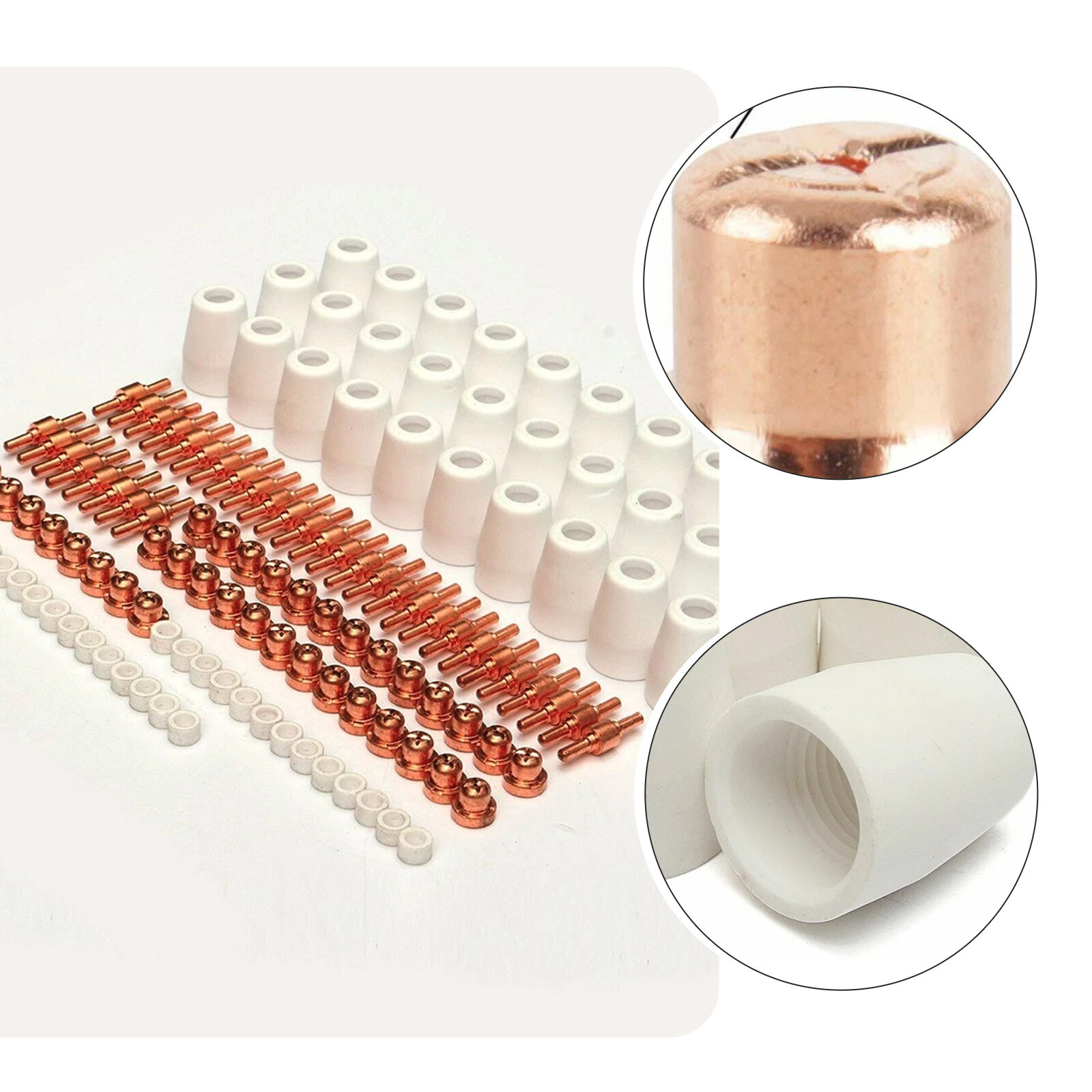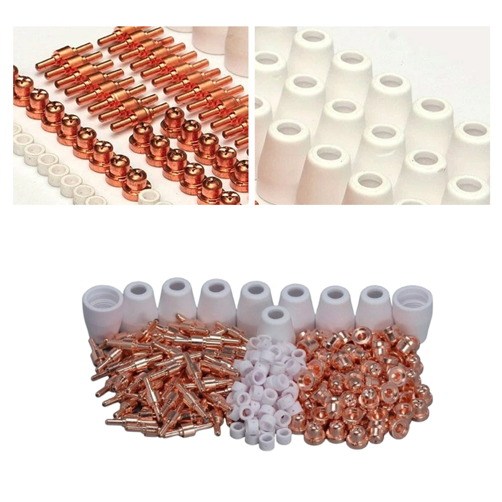 Consumables including : Parts Name: Quantity: Plasma torch Electrode 75pcs Plasma torch Tip 75pcs Plasma torch Swring Ring 75pcs Plasma torch Shield Cup 10pcs Description: PT-31 plasma torch consumable Heat Resistant Plasma Nozzle,Electrode etc Series of Accessoires Good Capacity *The consumables can work with ESAB/L-TEC PT-31, JG-40 and WSD-LG40 Cutting Torch, These torches for Plasma cutting machines such as CUT-40, CUT-40D,LGK-40, CT312,CT312D,CT416,CT416D,CT518, CT518D, Super160, Super160P etc.