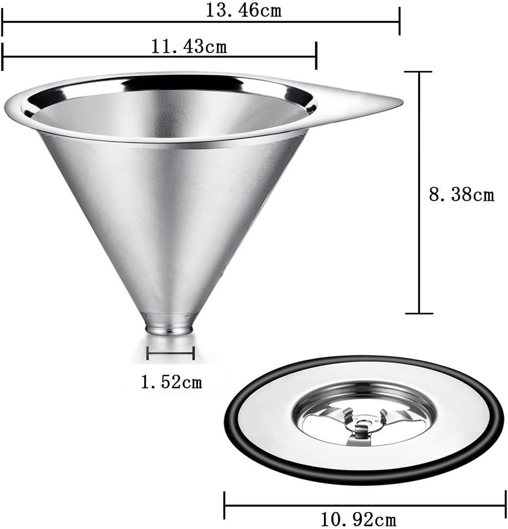 LHS Pour Over Coffee Dripper Stainless Steel Coffee Filter Metal Cone Filter Paperless Reusable Coffee Filter Single Cup Coffee Maker 1-2 Cup With Non-slip Cup Stand and Cleaning Brush 【TOP QUALITY】Our fine mesh stainless steel coffee filter is made of the highest quality stainless steel without using paper filters; the bottom base will stay on and not break; the extra fine wire mesh at the lower part of the filter ensure no grounds end up in your cup. 【SIMPLE TO USE】Simply heat the pour over coffee filter with hot water and rinse out, add coffee grounds, slowly pour in the hot water, let the coffee maker drip out the water through the fine pour over filter, and remove the coffee dripper when done, ready to enjoy your drink. 【WIDE CUP STAND】A wide metal cup stand makes our over coffee filter strong, stable and safe to use while you pour the water; It’s sized to sit over most single cup mugs and smaller travel canteens. 【PORTABLE】Compact and lightweight, the coffee dripper works great at home or work or while traveling or camping. 【EASY TO CLEAN】You can easily clean our coffee filter, just rinse and wipe it dry or place it inside your dishwasher, and small brush is a gift for you.