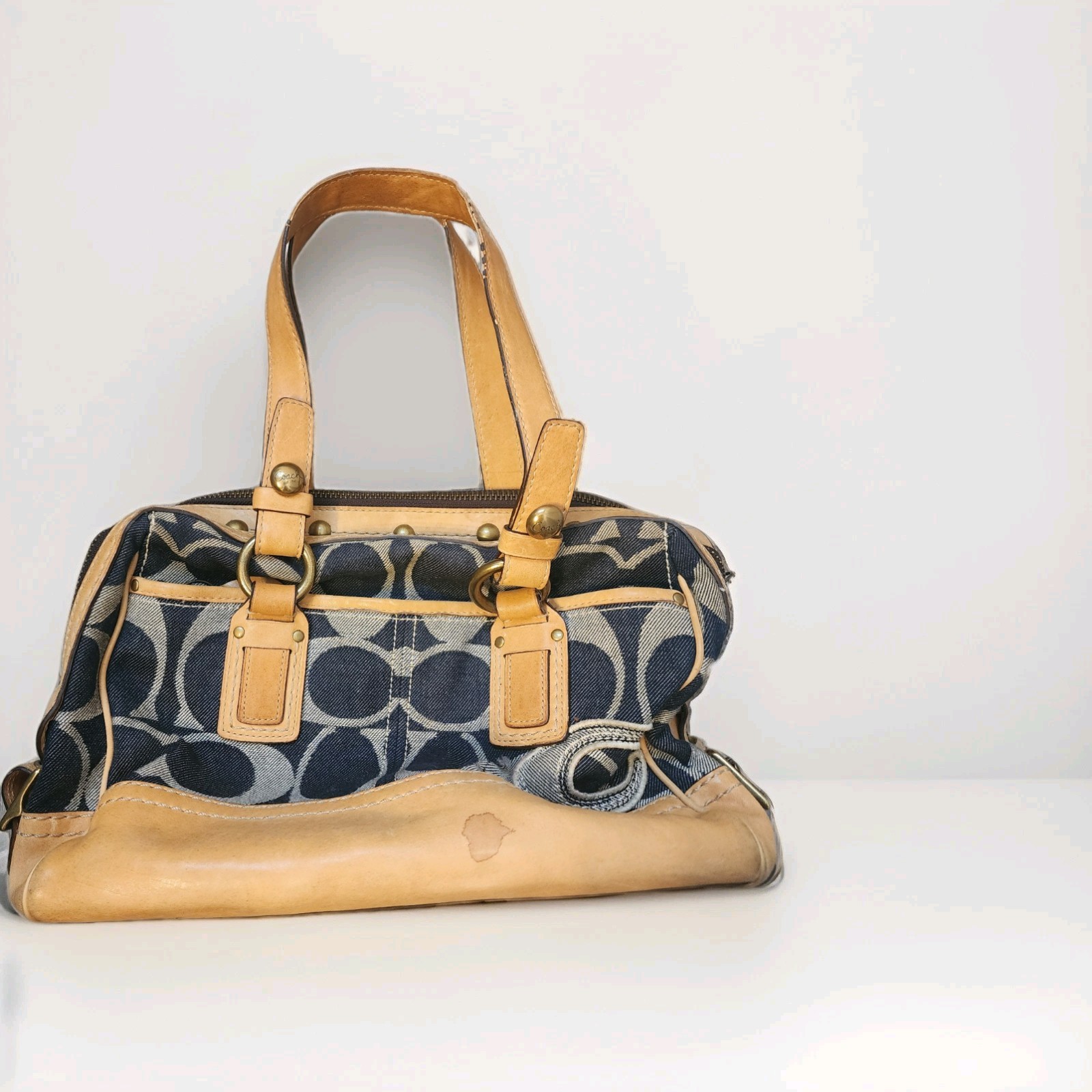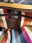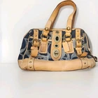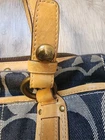 VINTAGE Coach Signature Denim Legacy Lily Satchel Shoulder Bag 11579 is a stylish and versatile handbag designed for casual occasions. Made with a combination of leather and denim, this rectangular-shaped bag features a signature pattern in blue and tan. The zip and turn lock closure adds a touch of security, while the brass/gold hardware adds a touch of elegance. With a shoulder strap handle style and a comfortable 8-inch strap drop, this bag is both practical and fashionable. The interior is lined with fabric and includes inner and outer pockets for organization. Perfect for everyday use, this Coach Legacy bag is a must-have for any woman's wardrobe.