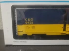 This is a Lionel O gauge Chesapeake & Ohio boxcar model 6-9426. It is a multicolor plastic model from the 1980s, featuring operating couplers and sliding doors that increase the car's play value. The boxcar is compatible with any 3-rail O gauge track brand, making it a perfect addition to O gauge layouts and collections alike.