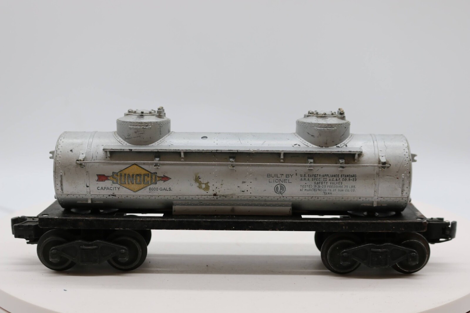 LIONEL TRAINS SUNOCO OIL TANKER 6465 O Scale. Looks great. Single Hole Chassis. Ships USPS PLEASE see photos for detailed condition!! There may be pieces that are missing or broken including, but not limited too, couplers, brake wheels, steps, ladders, railings, etc. May need detailed cleaning. PLEASE LOOK AT THE PHOTOS CAREFULLY BEFORE PURCHASING!! If you are purchasing more than one item from us and would like combined shipping, PLEASE request an adjusted invoice from us while still in the cart and BEFORE paying. eBay does not usually calculate combined shipping accurately and you might get overcharged. Please be aware that when we photograph items, we use lighting that will show the details well. Although we try to present the product as accurately as possible, the lighting may affect the overall look of the item by appearing lighter/darker or possibly a different hue than the actual item. Depending on the type of lighting you have in your home, there may be some differences between the photos and the actual item. If this is a concern of yours, please feel free to request additional photos made in natural lighting or ask for a more detailed description of the item PRIOR TO PURCHASE! PLEASE NOTE: We greatly appreciate your interest in our item for sale. We look forward to a pleasant, quick and satisfying transaction for everybody, so please note the following information before bidding. Thank you! ITEM DESCRIPTIONS: * We will try to describe items well and provide plenty of photos. Please review these carefully before bidding or purchasing. * Only the items pictured and described are what you will receive when purchased. * We will occasionally offer an item clearly marked "AS-IS". This means that we are not sure if it works because we are unable to test it for whatever reason. We will offer these at a discounted price than a similar "working" item. It is possible that these items will work fine, but it also is possible that these items are more useful for their parts. Please only bid on or purchase these items if you are well aware of this, as we will only provide refunds of actual item price (no shipping cost refunds) for these items. * If you have any questions that aren't addressed by the descriptions or photos, please feel free to ask before you bid. SHIPPING: * We offer international shipping, if you have any questions please reach out. * We try to pack items as carefully as possible, but damage may occur during shipping. If you receive an item that was damaged in shipping, please contact us and we will work with you to resolve the problem. * We will combine shipping costs for all items the same buyer purchases from us within 2 days. Please wait to pay for items until you're done shopping with us. Please contact us if you're expecting to buy more items from us, or to have us adjust the shipping costs. * We will usually ship items out within 24 hours of payment being received Sunday through Friday at noon. We will notify the buyer if there will be a delay in shipping for some reason. Please allow additional time for holidays and weekends when the post office is closed. If payment is received after noon (EST) on Friday, the item might not be shipped until the following Monday. * We do try to recycle shipping materials as much as possible. RETURNS: We abide by eBay's Money Back Guarantee. We definitely want our customers to be happy with their purchase! You may return an item within 30 days of receiving it with the following guidelines: * If the item is defective or damaged (unless we clearly marked the listing "AS-IS"), the buyer will receive a full refund after the buyer returns it and it is received by us. Customers who falsely claim their item is defective, damaged, or not as described in order to receive a full refund and free return shipping will be permanently blocked from making future purchases from us. * If the item is as described (including "AS-IS" items) and the buyer decides for any other reason than defective/damaged to return it, only the actual price of the item will be refunded once it has been returned and it is received by us. The buyer will be asked to pay all original and return shipping charges. This includes all reasons other than defective/damaged, including wrong size, wrong type, changed mind, etc. All "AS-IS" items will fall into this category of return. Please make sure the item is what you want before purchasing it. * Please contact us before initiating a refund request. FEEDBACK: We always leave feedback at the end of transaction. We consider the transaction to be over when we receive feedback from the buyer confirming the item arrived satisfactorily. If you are unsatisfied with your purchase please contact us before leaving neutral or negative feedback. WE APPRECIATE POSITIVE FEEDBACK IF YOU ARE SATISFIED WITH YOUR PURCHASE! THANK YOU FOR YOUR INTEREST IN THIS ITEM!