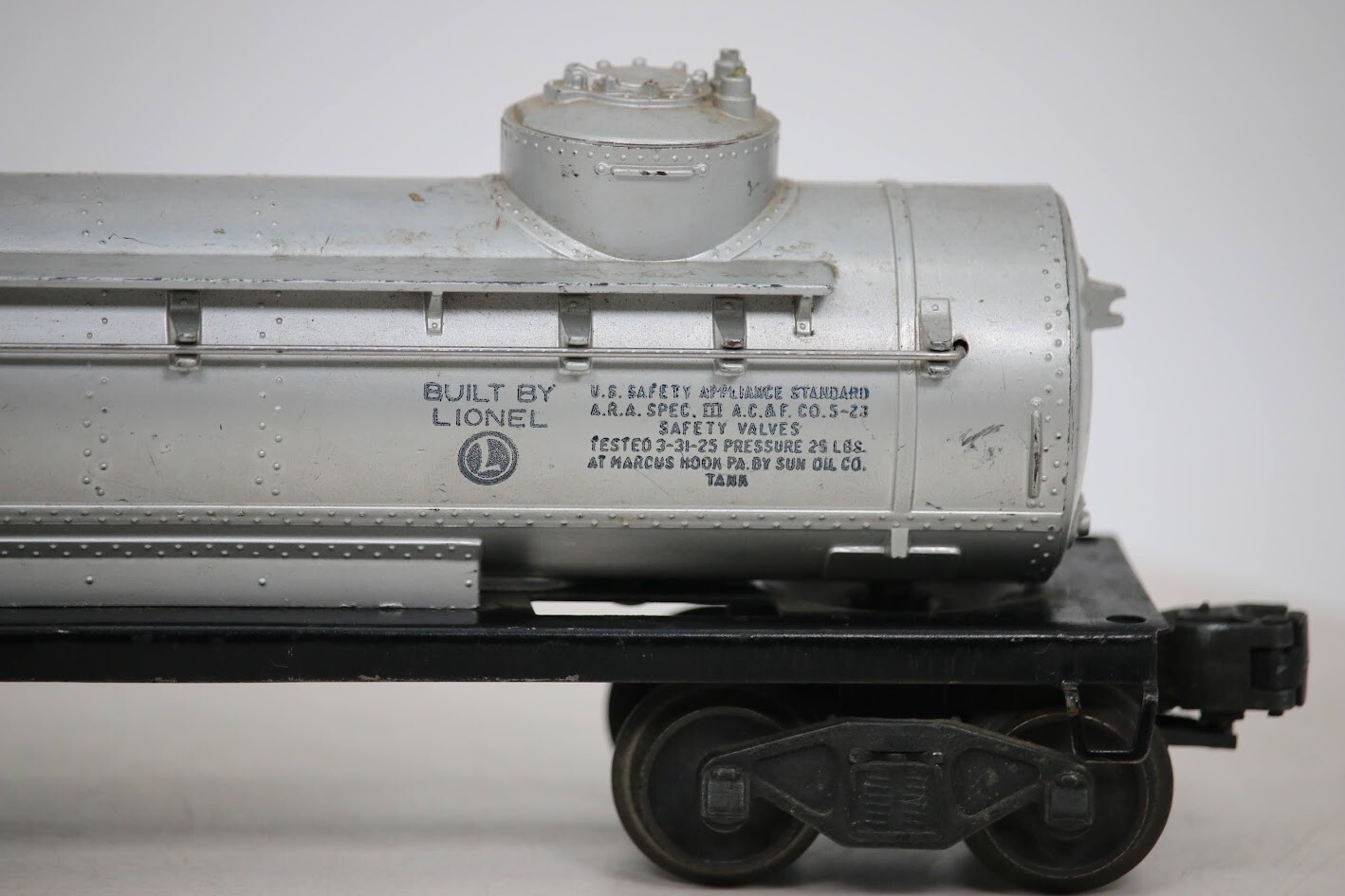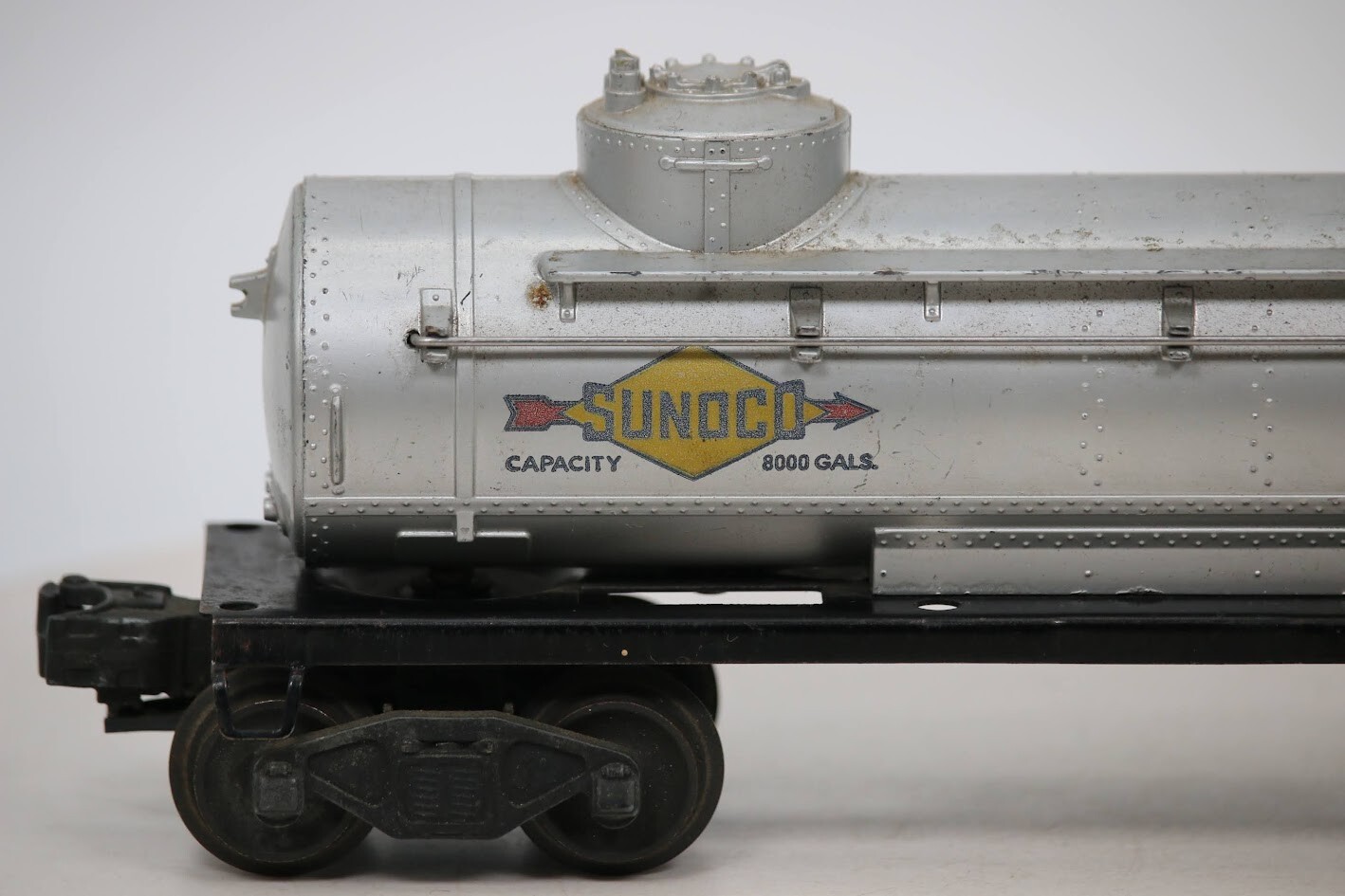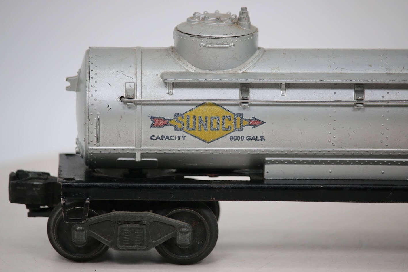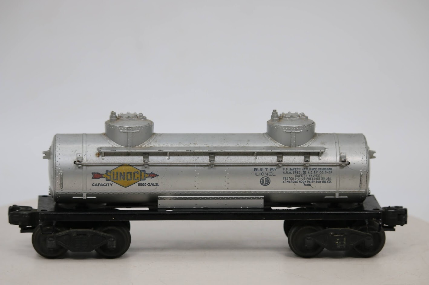 LIONEL POSTWAR 6465 SUNOCO DOUBLE DOME TANK CAR O GAUGE SKU#009792 PLEASE READ BEFORE PURCHASING Condition: Please review all photos carefully for details on the item's condition. Photos are part of the description, and any notable flaws will be highlighted. Combined Shipping: If purchasing multiple items, request a revised invoice before paying to ensure accurate combined shipping costs. eBay's system may not calculate this correctly, leading to overcharges. Lighting Disclaimer: Photos are taken under bright lighting to highlight details, which may cause slight variations in color or hue depending on your lighting. If you need additional photos (e.g., in natural light) or more details, please ask before purchasing. As-Is Items: Items come AS-IS. The way they appear in our pictures is how the Item will arrive to you. What's Included: Only the items shown in the photos and described in the listing are included in the purchase. We strive to describe items thoroughly and provide clear photos. If you have any questions or concerns not addressed in the listing, feel free to ask before purchasing. Thank you for shopping with us!