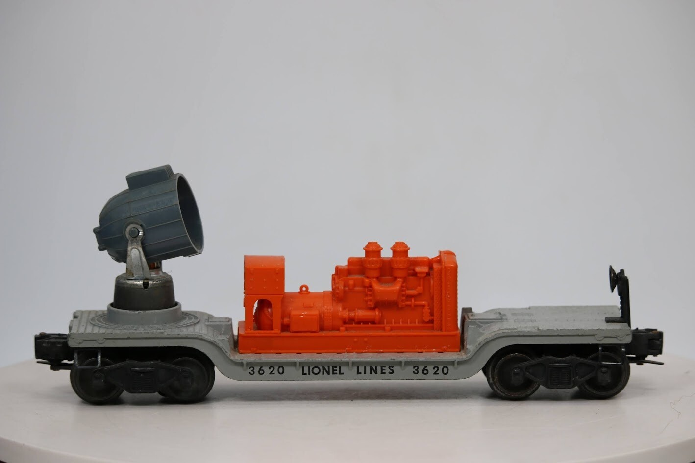 LIONEL POSTWAR #6520 "LIONEL LINES OPERATING SEARCHLIGHT CAR-VG. 1950-1951 SKU#007536 Look closely at the pictures to see further details. We ships USPS PLEASE see photos for detailed condition!! AC PLEASE LOOK AT THE PHOTOS CAREFULLY BEFORE PURCHASING!! If you are purchasing more than one item from us and would like combined shipping, PLEASE request an adjusted invoice from us while still in the cart and BEFORE paying. eBay does not usually calculate combined shipping accurately and you might get overcharged. Please be aware that when we photograph items, we use lighting that will show the details well. Although we try to present the product as accurately as possible, the lighting may affect the overall look of the item by appearing lighter/darker or possibly a different hue than the actual item. Depending on the type of lighting you have in your home, there may be some differences between the photos and the actual item. If this is a concern of yours, please feel free to request additional photos made in natural lighting or ask for a more detailed description of the item PRIOR TO PURCHASE! PLEASE NOTE: We greatly appreciate your interest in our item for sale. We look forward to a pleasant, quick and satisfying transaction for everybody, so please note the following information before bidding. Thank you! ITEM DESCRIPTIONS: * We will try to describe items well and provide plenty of photos. Please review these carefully before bidding or purchasing. * Only the items pictured and described are what you will receive when purchased. * We will occasionally offer an item clearly marked "AS-IS". This means that we are not sure if it works because we are unable to test it for whatever reason. We will offer these at a discounted price then a similar "working" item. It is possible that these items will work fine, but it also is possible that these items are more useful for their parts. Please only bid on or purchase these items if you are well aware of this, as we will only provide refunds of actual item price (no shipping cost refunds) for these items. * If you have any questions that aren't addressed by the descriptions or photos, please feel free to ask before you bid. * May need detailed cleaning SHIPPING: * We usually do not offer shipping to international addresses, but ARE WILLING TO TAKE CONSIDERATIONS. * We try to pack items as carefully as possible, but damage may occur during shipping. If you receive an item that was damaged in shipping, please contact us and we will work with you to resolve the problem. * We will combine shipping costs for all items the same buyer purchases from us within 2 days. Please wait to pay for items until you're done shopping with us. Please contact us if you're expecting to buy more items from us, or to have us adjust the shipping costs. * We will usually ship items out within 24 hours of payment being received Sunday through Friday at noon. We will notify the buyer if there will be a delay in shipping for some reason. Please allow additional time for holidays and weekends when the post office is closed. If payment is received after noon (EST) on Friday, the item might not be shipped until the following Monday. * We do try to recycle shipping materials as much as possible. RETURNS: We abide by eBay's Money Back Guarantee. We definitely want our customers to be happy with their purchase! You may return an item within 30 days of receiving it with the following guidelines: * If the item is defective or damaged (unless we clearly marked the listing "AS-IS"), the buyer will receive a full refund after the buyer returns it and it is received by us. Customers who falsely claim their item is defective, damaged, or not as described in order to receive a full refund and free return shipping will be permanently blocked from making future purchases from us. * If the item is as described (including "AS-IS" items) and the buyer decides for any other reason than defective/damaged to return it, only the actual price of the item will be refunded once it has been returned and it is received by us. The buyer will be asked to pay all original and return shipping charges. This includes all reasons other than defective/damaged, including wrong size, wrong type, changed mind, etc. All "AS-IS" items will fall into this category of return. Please make sure the item is what you want before purchasing it. * Please contact us before initiating a refund request. FEEDBACK: We always leave feedback at the end of transaction. We consider the transaction to be over when we receive feedback from the buyer confirming the item arrived satisfactorily. If you are unsatisfied with your purchase please contact us before leaving neutral or negative feedback. WE APPRECIATE POSITIVE FEEDBACK IF YOU ARE SATISFIED WITH YOUR PURCHASE! THANK YOU FOR YOUR INTEREST IN THIS ITEM!
