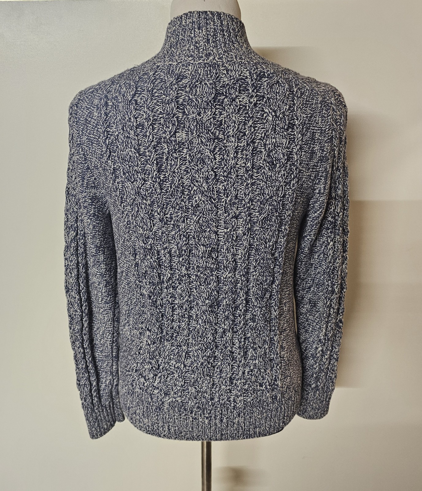 The LL Bean Beige Mock Neck Full Zip Cable 100% Cotton Cardigan Sweater in Size M is a classic and versatile piece for women's winter, fall, and spring wardrobe. Made from 100% cotton knit fabric, this full-zip cardigan features a mock neck and long sleeves, making it perfect for casual occasions. The cable design adds a touch of texture to the blue and white color, while the regular fit ensures comfort and style. Machine washable and with a zipper accent, this cardigan from L.L. Bean is a timeless piece that can be styled in various ways for a stylish look.