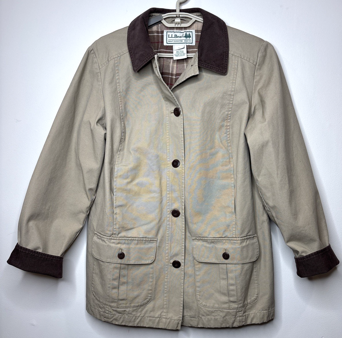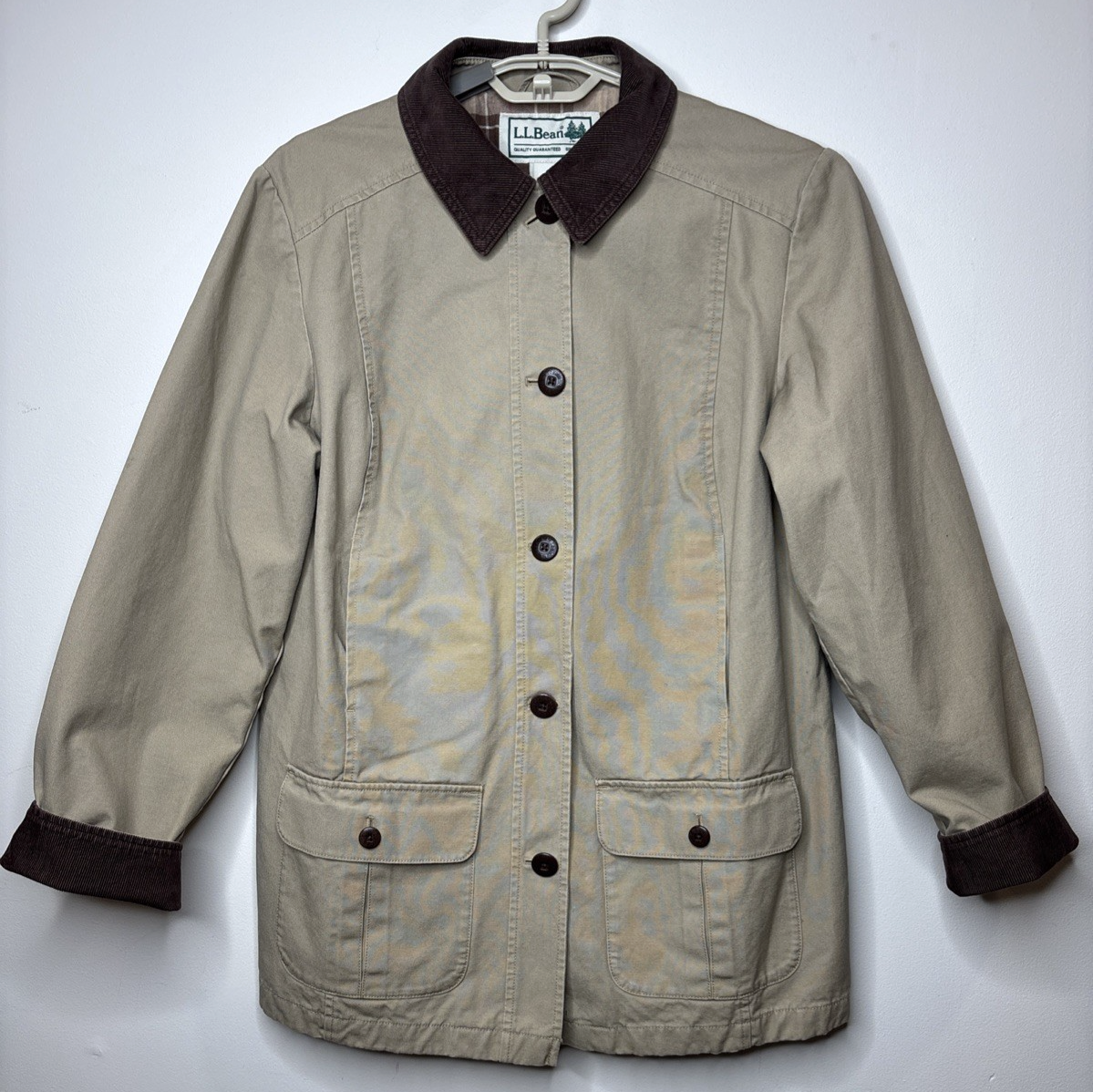 This LL Bean Women's medium Tan Canvas Flannel Lined Barn Chore Coat is a classic and outdoor-inspired overcoat perfect for the winter, fall, and spring seasons. Made with cotton canvas and flannel lining, it features a button closure, mid-length design, and long sleeves for added warmth. The light brown color and brown corduroy collar add a stylish touch to this versatile and practical piece, suitable for casual occasions. Machine washable for easy care, this jacket from L.L. Bean is a timeless addition to any woman's wardrobe. This jacket is preowned; please look at all pics and measurements as they are part of description. There are no rips or tears, and all pockets are in great shape. shoulder to shoulder 18", pit to pit 22" arm length 22.5", back length 28.5"