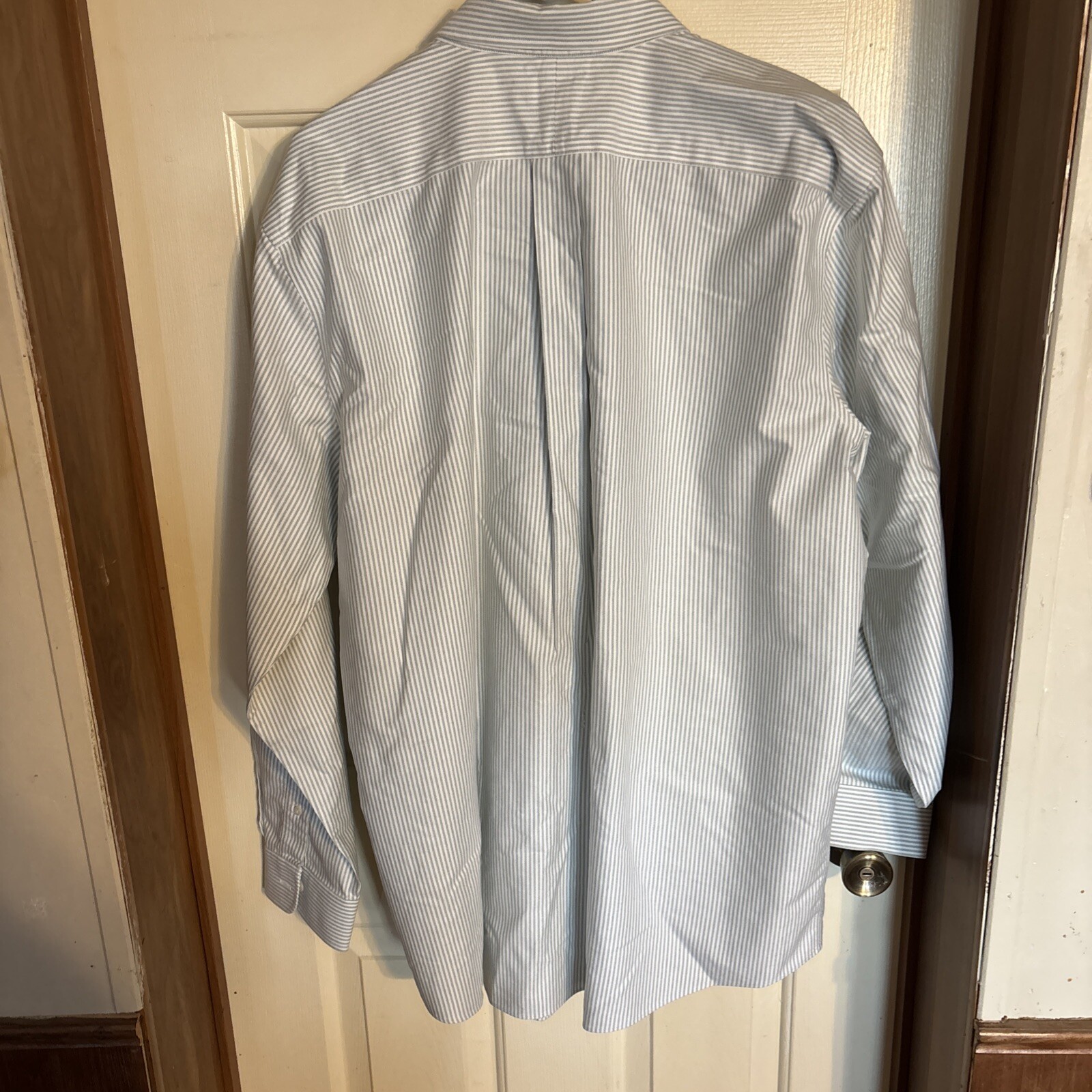 This is an L.L. Bean men's button-up shirt in size 17.5, featuring a green and white striped pattern. It has long sleeves, a button-down collar, and is made of wrinkle-resistant cotton material. Suitable for travel, casual outings, and business settings, this shirt is designed for a regular fit and is ideal for the winter, fall, and spring seasons. Made in Malaysia. Chest: Pit to Pit-25” Sleeve: Shoulder to Cuffs Edge-26 1/2” Length: Neck to Seam-35” International charges are the buyer’s responsibility. No international returns.