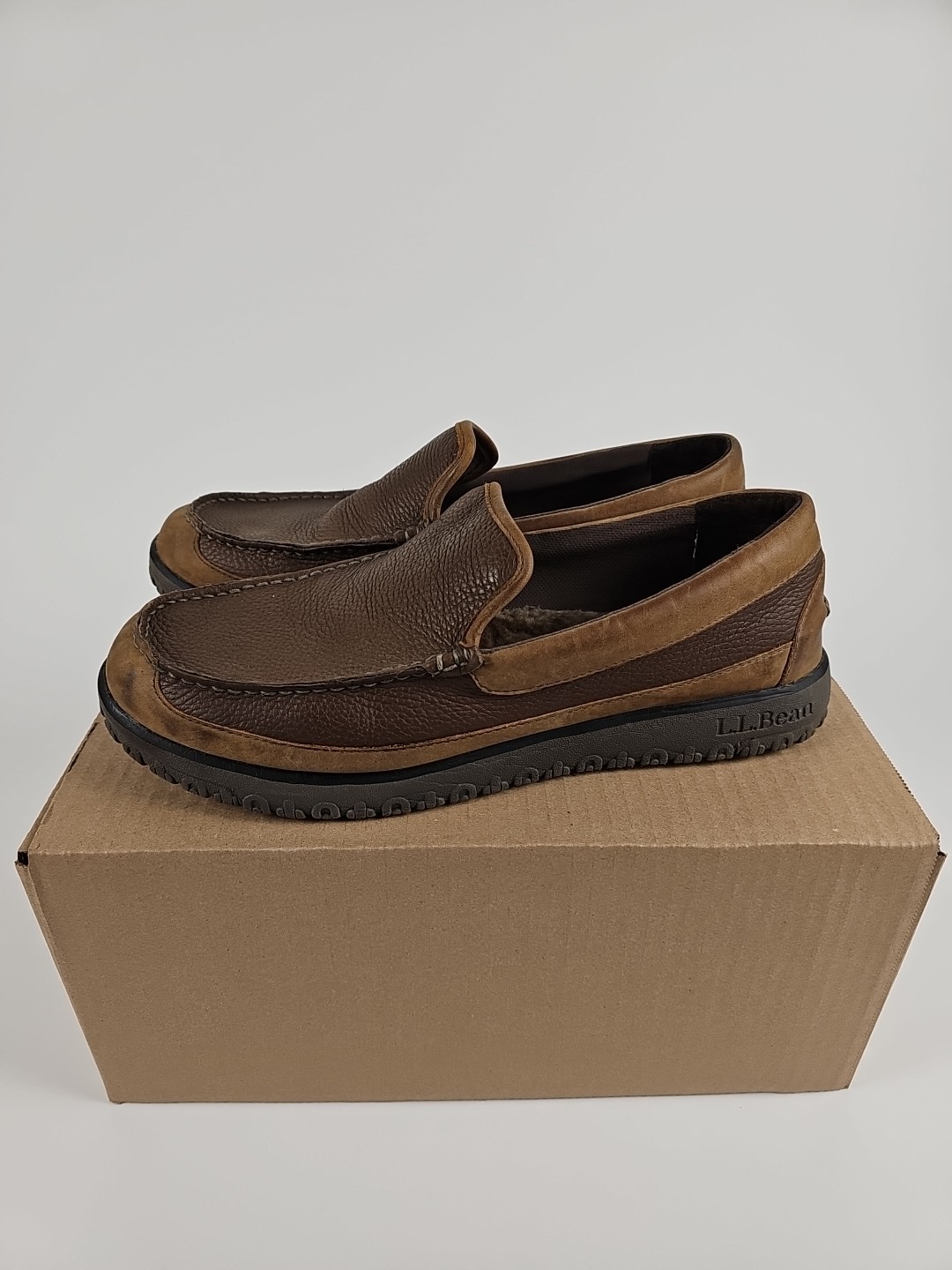 The LL Bean Men's All Week Slipper Mocs in brown leather with shearling lining are a classic and comfortable choice for casual wear. These slip-on moccasins feature a round toe, flat heel, and a lined interior for added warmth during the winter season. With a solid brown color and leather upper material, these slippers are both stylish and durable. Perfect for men looking for a high-quality and timeless footwear option, these LL Bean slipper mocs are a reliable choice for all week wear.
