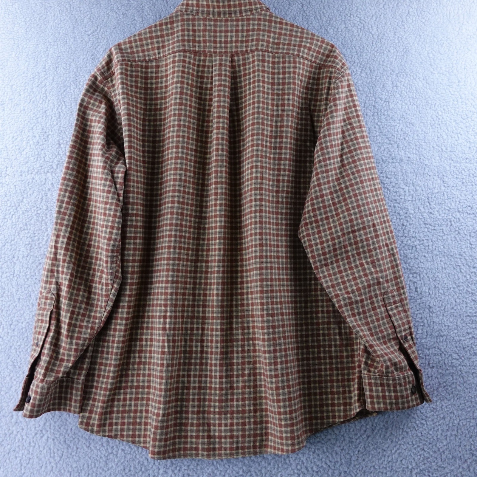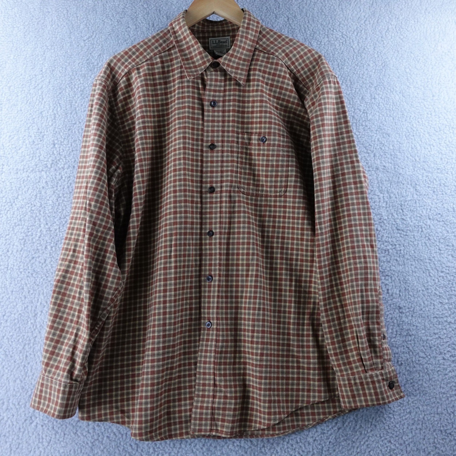 Embrace classic comfort with this LL Bean flannel shirt. The rich plaid pattern in earthy tones evokes a sense of rugged outdoors and cozy evenings by the fire. Crafted from soft, breathable cotton, this long-sleeve button-up offers reliable warmth and durability for everyday adventures. Perfect for a casual weekend outing, hiking through autumn foliage, or layering on a chilly evening. Sleeve Length: Long Sleeve Department: Men Fabric Type: Flannel Closure: Button Accents: Button Pattern: Plaid Theme: Outdoor, Classic Material: Cotton Fit: Regular Features: Pockets Collar Style: Button-Down Type: Button-Up Neckline: Collared Occasion: Casual Season: Fall, Spring, Winter Chest Size: 41 in Keywords: LLBean, menswear, plaidshirt, flannel, outdoors, casual, workwear, buttondown, longsleeve, cotton, heritage, rugged, cozy, layering