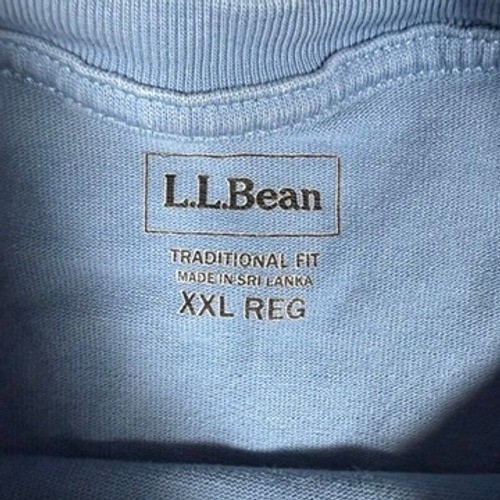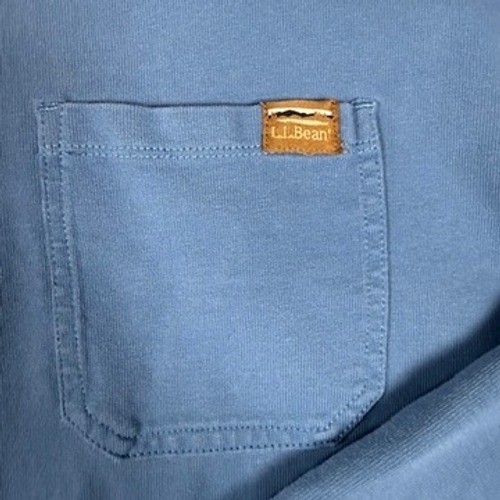LL Bean long sleeve pocket t-shirt in a classic blue shade. This traditional fit top is crafted from a comfortable cotton blend with a ribbed crew neckline and matching ribbed cuffs. A single chest pocket features the iconic LL Bean mountain logo patch, adding a touch of outdoor heritage to this versatile everyday essential. Perfect for layering or wearing on its own, it offers a relaxed silhouette and durable construction typical of the brand's quality.