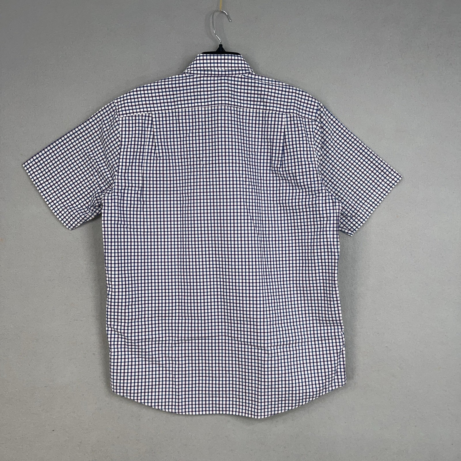 Gently worn, no visible flaws noted. Buttons intact and collar points secure; light wrinkling from storage. No stains, holes, or snags observed. Brand: L.L.Bean Label details: Since 1912 Quality Guaranteed; Traditional Fit What it is: Mens short sleeve button-front shirt with button-down collar Pattern/Color: Blue and red check plaid on white Material: 100% Cotton Tag size: M-REG (Mens Medium) Features: Left chest pocket; curved hem; back yoke with pleats Style: Classic casual/preppy traditional fit Notes: Please see photos for measurements and additional details Measurements: - Previous washings may change the sizing written on the tag. - Please refer to the photos above for all measurements. - Please compare our measurements to that of one of your favorite garments. - Please note, item measurements are approximate . All items are bagged and sealed after being photographed, then stored in a smoke free environment to ensure the item is exactly the same as when photographed. All items have been washed per eBay standards & policies. I carefully package and ship daily. Feel free to contact me with any questions.