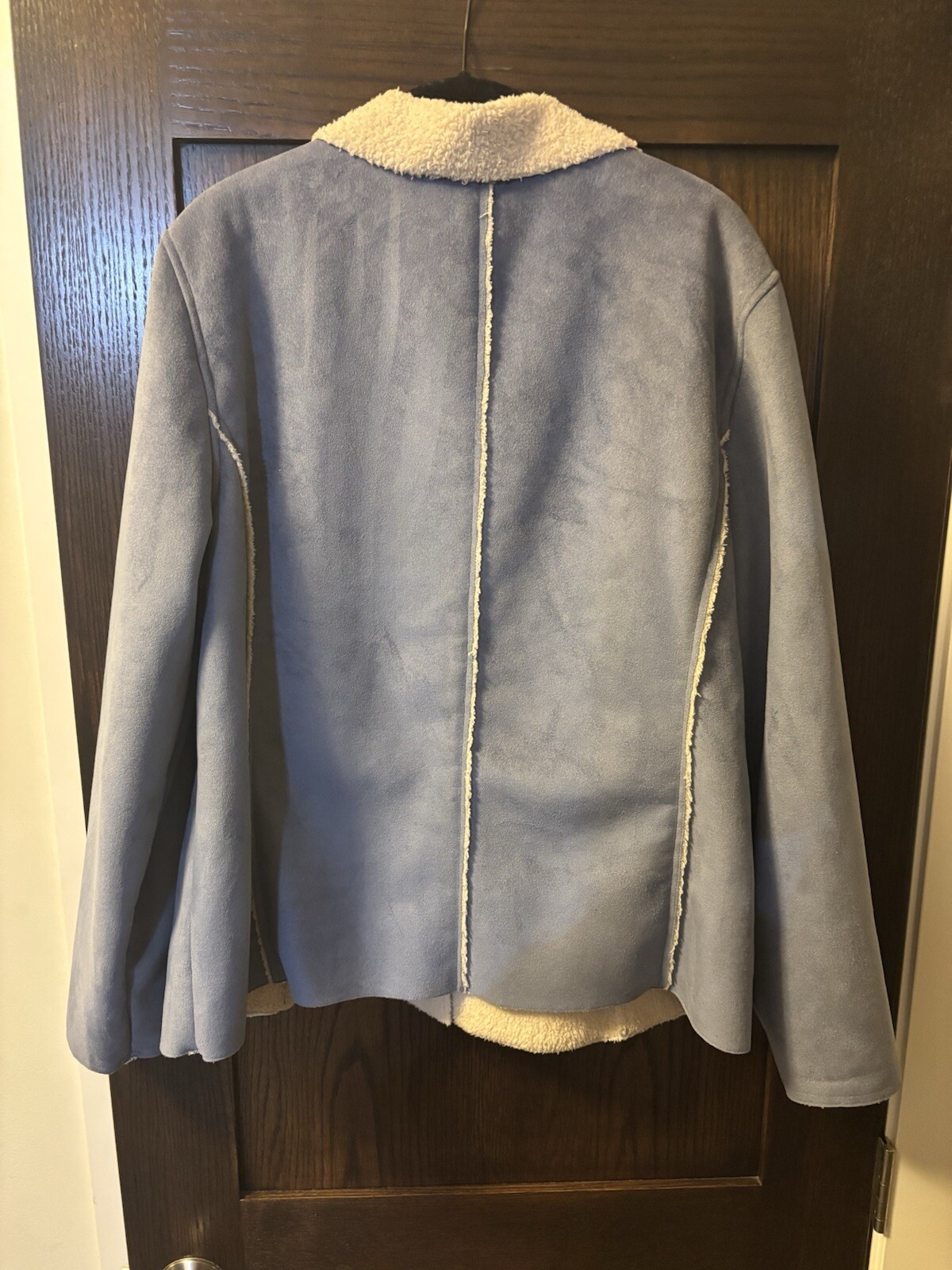 This is an L.L. Bean women's jacket in size XL, featuring a faux shearling outer shell material in a stylish ice blue color. The jacket is designed with a button closure for easy wearing. Perfect for staying cozy and fashionable during colder weather, this basic jacket has a shearling fabric type that adds a touch of warmth and luxury to the overall look.