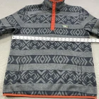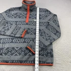 Brand: L.L.Bean Item: Men's fleece snap-front pullover, slightly fitted silhouette Tag size: M REG (Mens Medium), "Slightly Fitted" per neck print Material: 100% Polyester (exclusive of trim) Color/Pattern: Gray with darker gray Aztec geometric stripes and bright orange contrast trim Features: Quarter snap-front placket; stand/Mock neck; front kangaroo hand pocket with smooth lining; side-entry hand warmers; contrast binding at cuffs and hem; warm, soft fleece construction Brand markings: L.L.Bean woven patch at left chest; printed neck label with fit and content info Style/IDs from tag: Men's item# 500682; RN 73441; VN1002746 Country of origin: Made in Jordan Fit notes: Slightly fitted cut; please compare to measurements shown in photos for best fit Special notes: Colors may vary slightly due to lighting/monitor settings