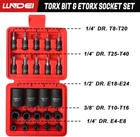 Torx Bit Socket and Female External Set 24PCS, LLNDEI 10 Star 24PCS Product Details Brand: LLNDEI Material: Chrome Vanadium Steel Drive System: Torx, Star, Torq-Set Finish Type: black phosphate finish Number of Pieces: 24 Manufacturer: LLNDEI Part Number: LLNDEI 24 Item Weight: 13.8 ounces Product Dimensions: 5.12 x 4.72 x 2.2 inches Country of Origin: China Item model number: LLNDEI 24 Size: 24PCS Finish: black phosphate finish Shape: torx Power Source: manual Torque: 569 Newton Meters Item Package Quantity: 1 Measurement System: Metric Compatible Fastener Range: 0.375 inches Included Components: TORX BIT SOCKET 1/4"DRIVE:T8,T9,T10,T15,T20,T25,T27,T30,T35,T40, E-TORX SOCKET 3/8"DRIVE:E10, E11, E12, E14, E16, E-TORX SOCKET 1/2"DRIVE:E18, E20, E22, E24, E-TORX SOCKET 1/4"DRIVE:E4, E5, E6, E7, E8 Batteries Included?: No Batteries Required?: No Brand: LLNDEI Material: Chrome Vanadium Steel Drive System: Torx, Star, Torq-Set Finish Type: black phosphate finish Number of Pieces: 24 Chrome Vanadium Steel DURABLE: Female Torx socket set & star bits set meets ANSI and DIN performance standards, constructed of heat-treated chrome vanadium steel(50BV30)and S2 with black phosphate finish for strength and durability. E-TORX SOCKET SET INCLUDE: 1/4"drive: E4, E5, E6, E7, E8; 3/8"drive: E10, E11, E12, E14, E16; 1/2"drive: E18, E20, E22, E24. TORX BIT SET INCLUDE: 1/4" drive:T8,T9,T10,T15,T20,T25,T27,T30,T35,T40. WIDE APPLICATIONS: Torx and e-Torx sockets can meet your requirements for multiple projects, it is an essential tools for your car, motorcycle, bicycle, lawn equipment, electrical appliances, machinery, etc. EASY TO USE: The torque socket set is equipped with a dedicated storage box, and each position is marked with dimensions for secure storage, laser etched high contrast and specific size marks make identification easier. 【889 certification】Our product has obtained U.S. Section 889 certification and meets all government requirements, so you can purchase with confidence.
