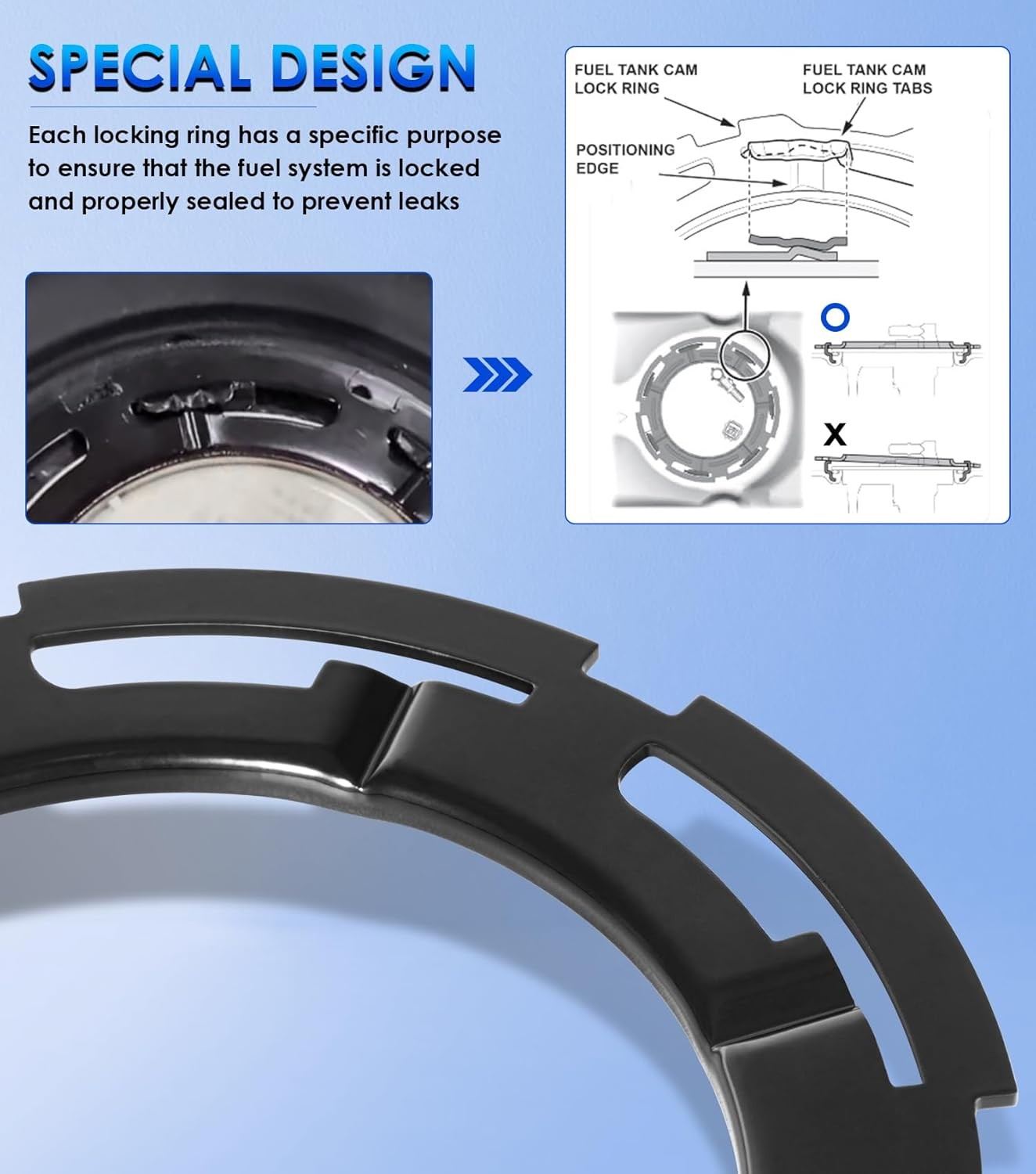 Fitment: The LO164 fuel pump lock ring fits for Buick Cadillac Chevrolet Dodge Ford GMC Hummer Isuzu Jeep Lincoln Mazda Pontiac Ram Saab Saturn Suzuki Volkswagen GM. Designed and manufactured to OEM specifications to ensures a perfect fit Features: 1) If the factory part number is listed below, this locking ring will be a perfect match. Replace the known part number 10325852, 4721916AA, 55366299AA, 579102, 579127, 68201, 94702378, LR3004, LR7003, SPILO164, SPILO166, TLR14, TLR15, TR26, etc 2) Replace the old lock ring which is easy to rusted or damaged due to corrosion long-term time, especially for vehicles in areas with snow. This lock ring is required for fuel pump or fuel module replacement, it usually gets damaged when removing fuel pump 3) Just remove the old lock ring, and install directly new locking ring and secure it in place. You can select our matching fuel tank ring tool to help tackling the job of replacing the fuel sender lock ring fast and effectively without damage the lock rings 4) Made of premium steel with outstanding solid and great durability. Surface coated with black oxide finish for excellent resists rust and corrosion, can withstand harsh environmental conditions. High precision ensures a perfect fit for preventing the fuel tank leak 5) LO164 fuel tank lock ring is used to replace the old lock ring, which is prone to rust or damage due to long-term corrosion. The locking ring needs to be replaced when the fuel pump or fuel module is changed. Replace number 10325852, 4721916AA, 55366299AA, 579102, 579127, 68201, 94702378, LR3004, LR7003, SPILO164, SPILO166, TLR14, TLR15, TR26 Package included: LO164 fuel pump lock ring