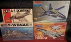 This lot of 4 model aircraft kits features a Blue Angels F-18 Hornet, an F-14A Tomcat, a F-15 Eagle, and a Lindberg A-4 Skyhawk aircraft. The 1:48 scale set is from the Military Aircraft franchise and is designed for ages 8-11 years. The kit includes aircraft models with a skill level of 2 (easy) and is themed around militaria. Features include unpainted parts, making it a fun project for model enthusiasts. Unused & New In Box. THESE MODEL KITS COME TO YOU FROM A PET FREE AND SMOKE FREE HOME! THESE MODEL KITS WERE PICKED AT AN ESTATE SALE, AND I WILL NOT BE RESPONSIBLE FOR BOX SHELF WEAR OR MISSING ITEMS. SOLD AS-IS...NO RETURNS, NO REFUNDS.