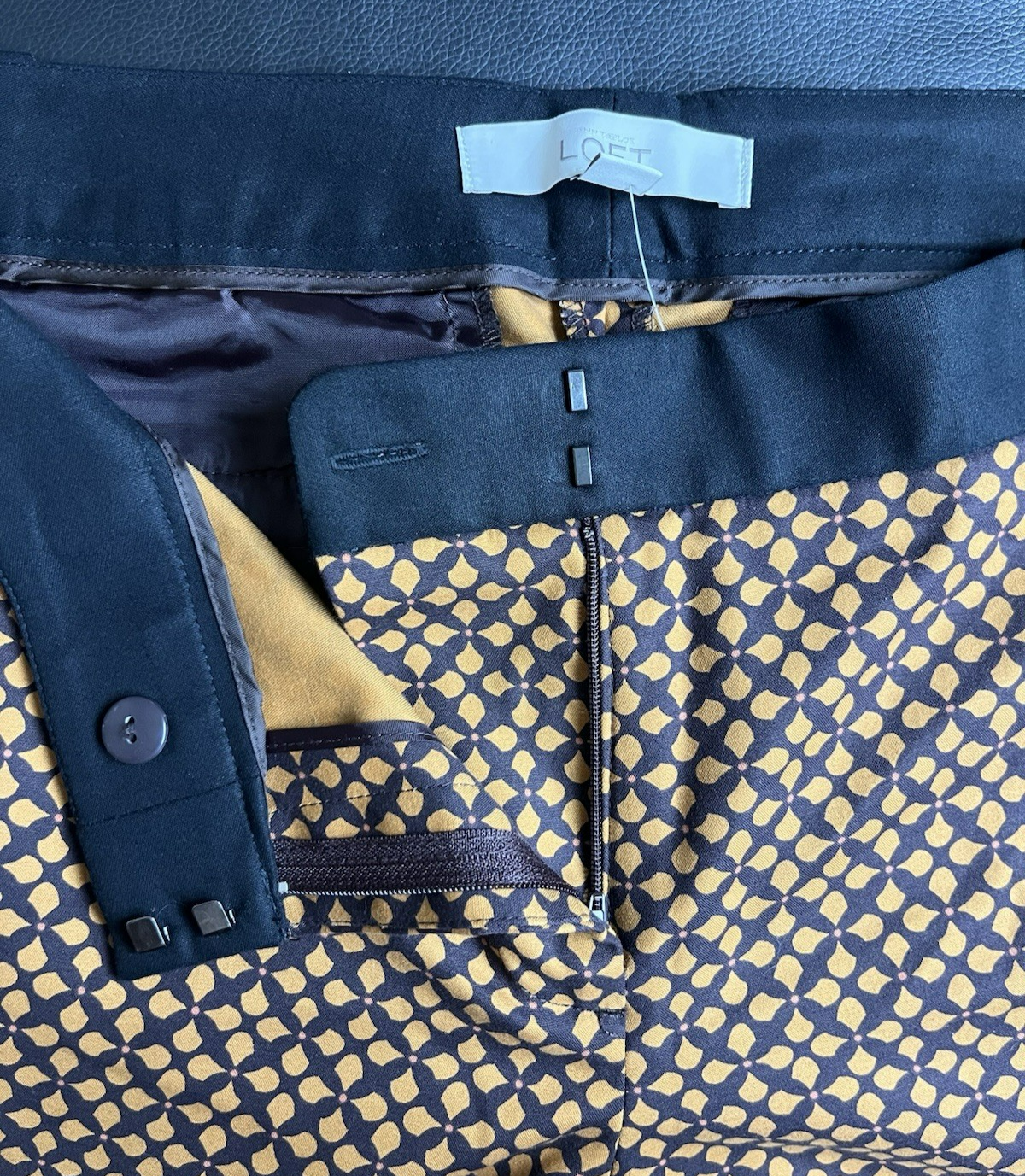 Please refer to the photos for measurements. Offers are welcome, and we are happy to provide additional pictures or measurements upon request. Thank you! Condition: New without tags (NWOT) condition with no visible flaws, defects, or signs of wear. Description: Ann Taylor LOFT Zoe Ankle Pants, size 8. These striking pants feature a retro geometric print in a rich combination of black and orange/tan. They are made from a comfortable stretch cotton blend of 97% Cotton / 3% Spandex. The Zoe fit is designed to sit low on the waist and is the straightest in the hip. Originally retailed for $69.50, this style is perfect for workwear, business casual, or achieving a Retro or Mod aesthetic. They were made in Thailand.