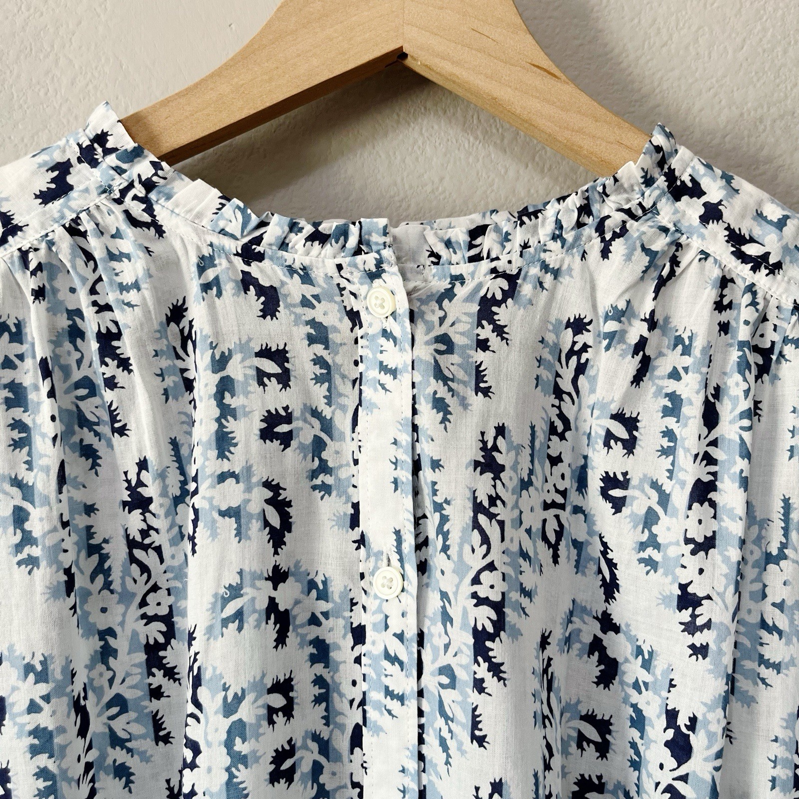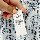 Brand new with tags LOFT long sleeve button front blouse in white with blue floral print. Size small. Ruffle details at neckline and wrists. Balloon sleeves. Slight high-low hem. NWT. Coquette, Victorian, dainty, romantic. All measurements are approximate, not exact. Length: 21-25" Pit to pit: 24" measured flat Sleeve length: 19.25"