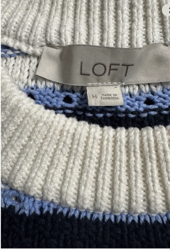 The LOFT Size Medium Blue White Striped Crewneck Sleeveless Sweater Vest Top is a stylish and versatile addition to any woman's wardrobe. Made from a comfortable cotton blend material, this sleeveless sweater vest is perfect for layering over shirts or dresses. The classic blue and white striped design adds a touch of sophistication to any outfit, making it a great piece for both casual and formal occasions. With its crewneck and vest style, this sweater is sure to become a staple in your closet for seasons to come.