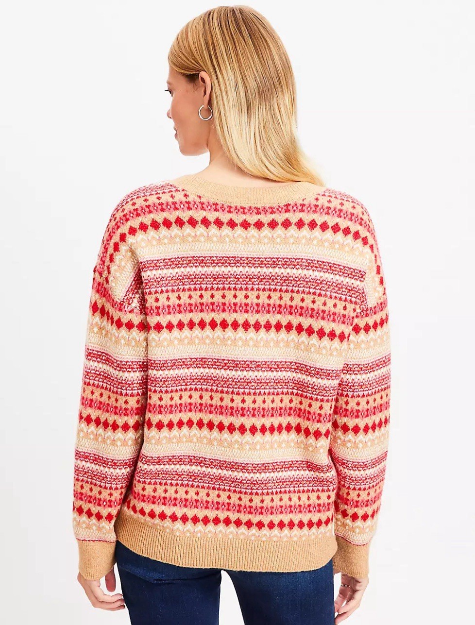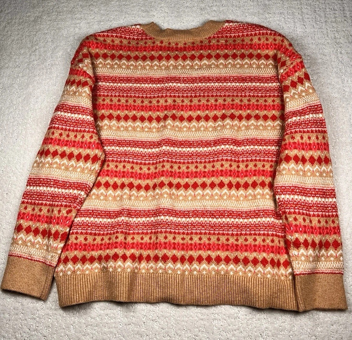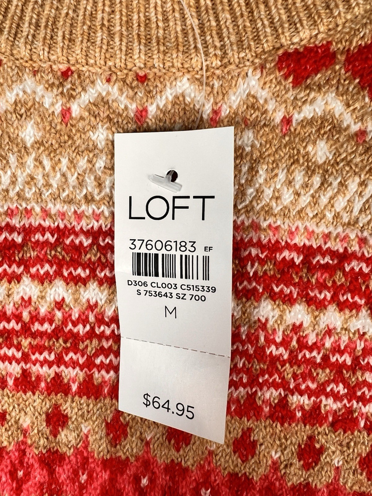 LOFT Women's Striped Fair Isle Size Medium Crewneck Sweater Tan Red Pink NWT. Condition is New with tags. Shipped with USPS Ground Advantage.