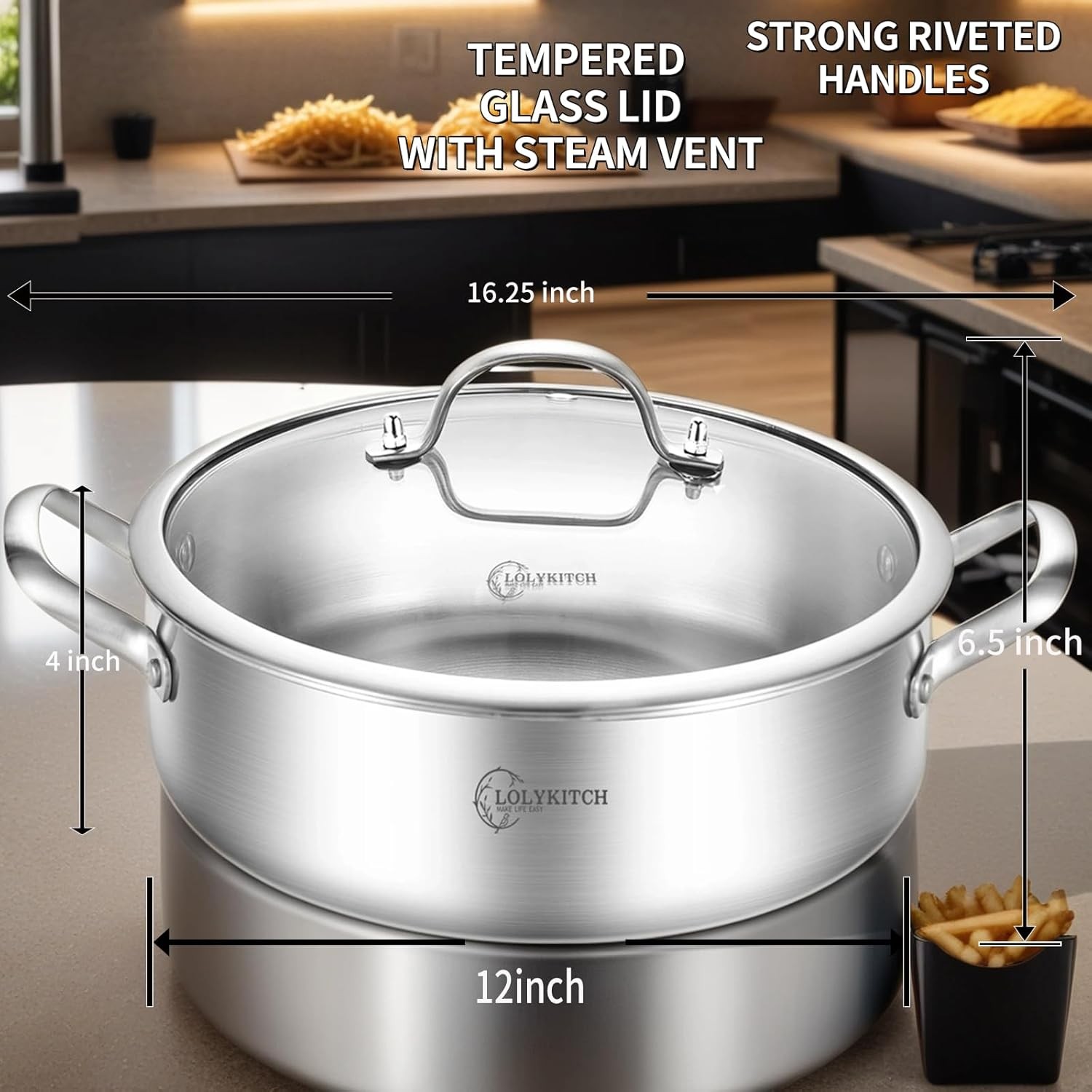 LOLYKITCH 7 Quarts Tri-Ply Stainless Steel Sauté Pan with Lid,12 7 QT, Silver Product Details Brand: LOLYKITCH Material: Stainless Steel Special Feature: DISHWASHER SAFE, OVEN SAFE, Heavy Duty Color: Silver Capacity: 7 Liters Compatible Devices: Smooth Surface Induction, Gas, Electric Coil Product Care Instructions: Dishwasher Safe Maximum Temperature: 500 Degrees Fahrenheit Handle Material: Stainless Steel Item Weight: 6.2 Pounds Is Oven Safe: Yes Model Name: LOLYKITCH-SAUTE-BASIC Has Nonstick Coating: No Is Dishwasher Safe: Yes Recommended Uses For Product: Stir Frying, Sautéing, Frying Manufacture Year: 2023 Product Dimensions: 16 x 12 x 4 inches Item Weight: 6.2 pounds Manufacturer: HUAHAO Item model number: LOLY-SAUTE Tri-Ply Clad: Made with a high pure aluminum core bonded together with 2 layers of durable stainless steel, excellent durability and even heat distribution,saved energy more than 20% Food Grade Suface: Highly polished 18/8 food grade stainless-steel cooking surface with starburst,plus won’t adverse react with food Cool Touch Double Handles: Secured with double side stainless-steel handles to ensure a safe grip and balance while providing cool touch handles Suitable for All Stoves:Works on all cook stovetops, include induction stove,to ensure you can use the pan in any kitchen Your Reliable Partner:PFOA-Free and SGS Certified for peace of mind. Lolykitch cookware heats quickly and spreads heat evenly, we insist to make cooking easy