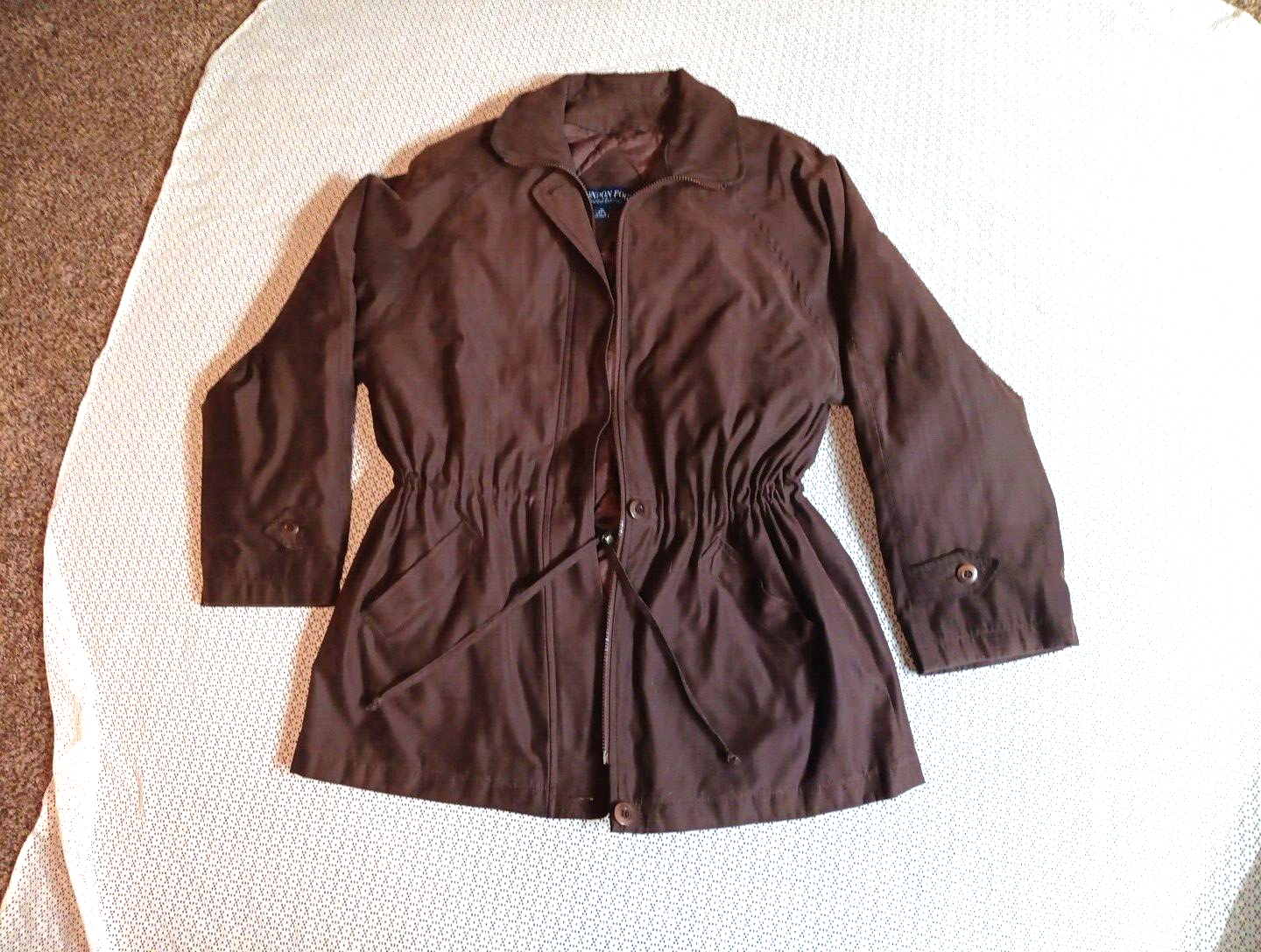 LONDON FOG Limited Edition - Ladies Collared Chocolate Brown Coat Jacket Size XL. Quilted lining, inner pocket, outside pockets, Zipper and Buttons, Drawstring Waist. Pit to pit is 22 1/2" and the length is 32 1/2".