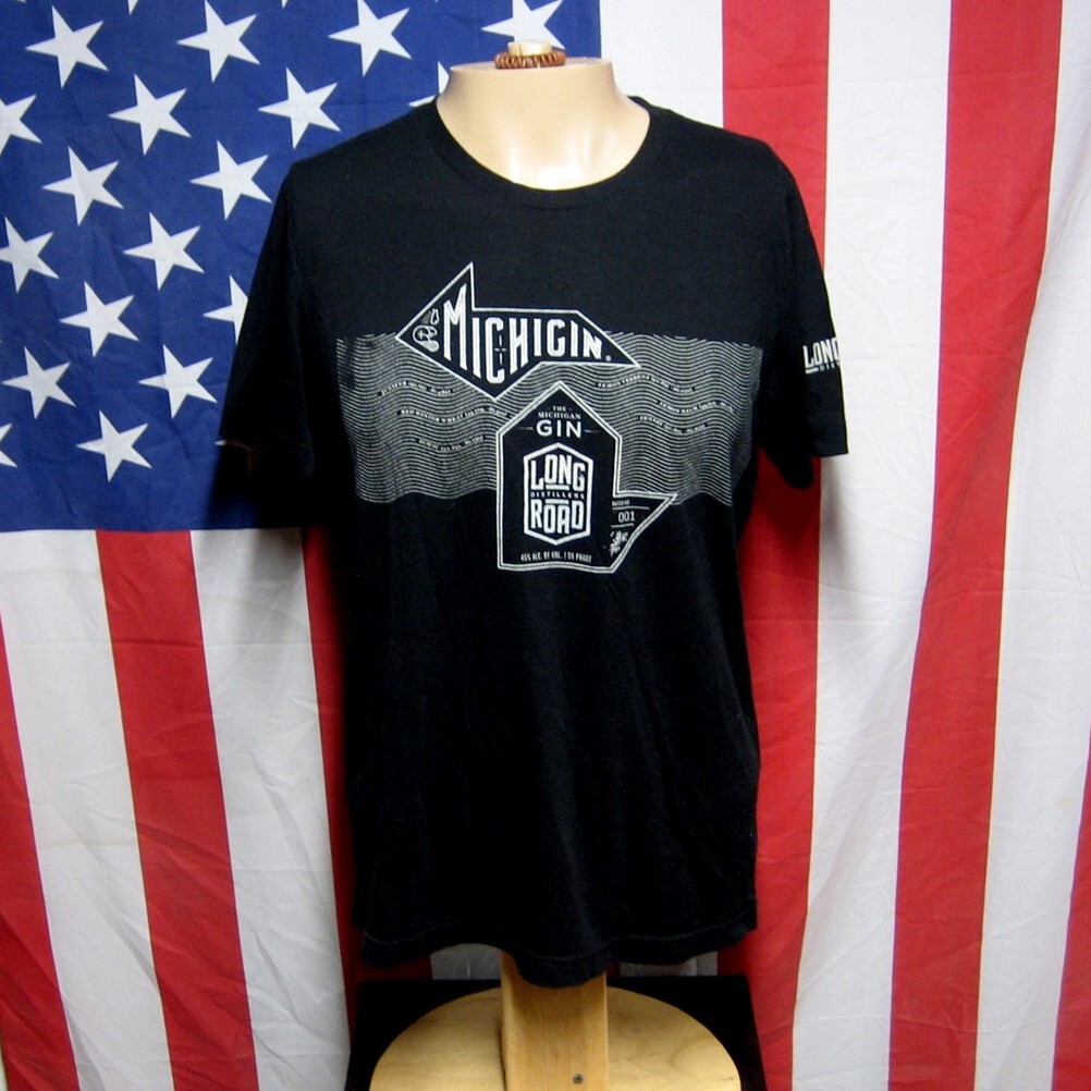 LONG ROAD DISTILLERS med T shirt Michigan Gin tee Grand Rapids booze logo This is a previously-owned, adult-medium (M), black T-shirt with “Michigan / The Michigan Gin / Long Road Distillers” printed on the front and “Long Road Distillers” printed on the sleeve. It measures approximately 18 inches (from underarm seam to underarm seam), about 25 inches from back collar to bottom, and is in great condition (Canvas brand, 50% cotton / 25% polyester / 25% rayon). Long Road was the first distillery in the history of Grand Rapids. They create world-class spirits from Michigan-grown ingredients without cutting corners. Powered by SixBit's eCommerce Solution