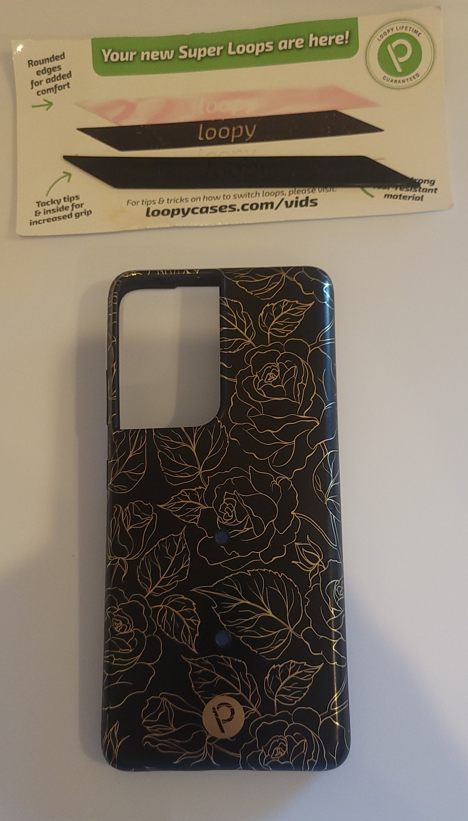LOOPY Case Samsung Galaxy S21 ULTRA Black with Gold Metallic Roses + 1 New Loop This great phone case looks like new and comes from a smoke-free home. Please see my other auctions, I will combine shipping!