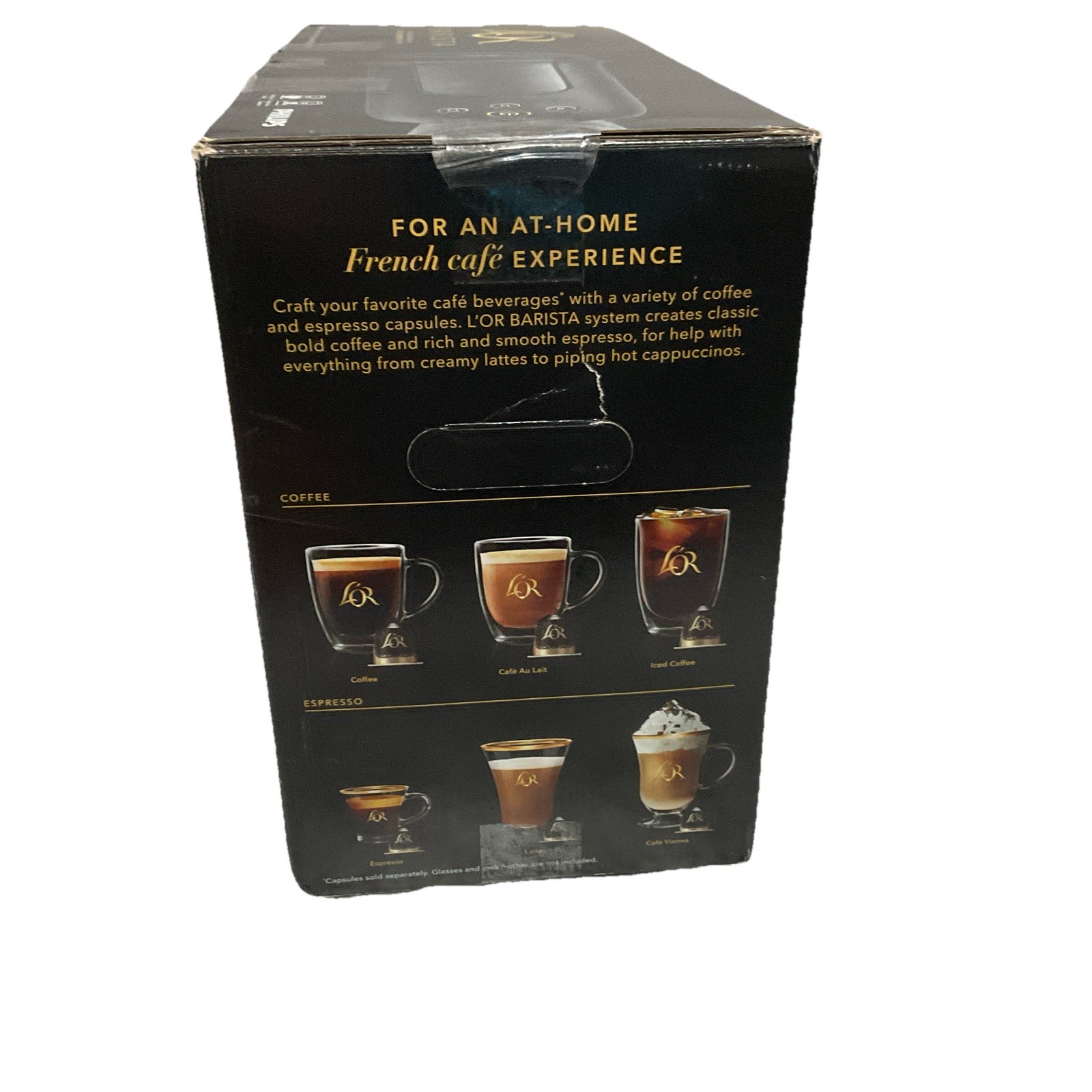 The L'OR Barista Coffee & Espresso Machine System is a sleek black espresso machine that operates on a wall plug-in power source. With a high-pressure system of 19 bars, it is designed to make delicious espresso and cappuccino using Nespresso capsules. Made of plastic with a matte finish, this machine features a water tank and drip tray for easy cleaning. The components included in the package are a user manual, water tank, and drip tray. Perfect for coffee enthusiasts looking for a convenient and efficient way to enjoy their favorite espresso drinks at home.