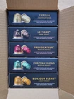 10 capsules in each box, 5 boxes total. Chateau, provocateur, bonjour, le tigre, and vanilla. Best before October 1 2024 or later. For L'OR barista system coffee machines only.