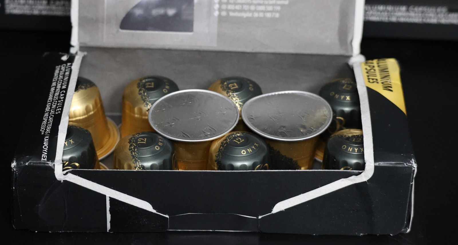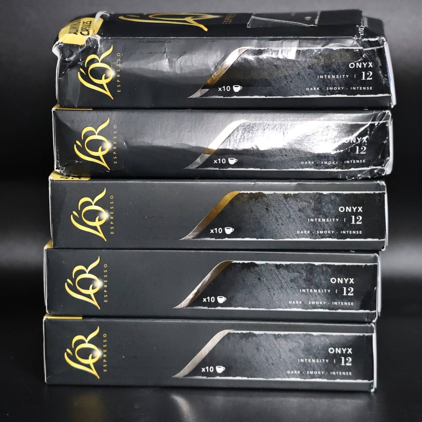 L'OR Espresso - Onyx, Level 12 Intensity Dark Roast, EX: 5/26 *50 CAPSULES* Includes 5 boxes - each box contains 10 capsules - 50 total capsules One box has been opened but all capsules are sealed Some boxes have minor damage - all shown in photos