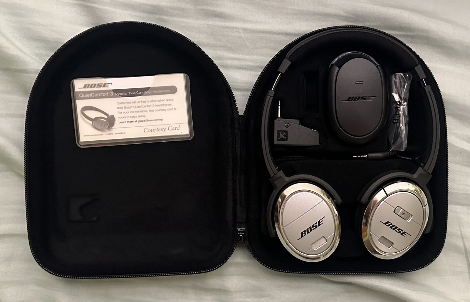 Suitable For:DJ, Live Monitoring, Studio MonitoringColor:Black, SilverModel:Bose QuietComfort 3MPN:370510-0010Cable Length:5ftManufacturer Warranty:No WarrantyUPC:017817614009gtin13:017817614009Brand:BoseForm Factor:HeadbandYear Manufactured:2010sNumber of Earpieces:DoubleImpedance:32 ohmConnectivity:3.5mm JackType:Ear-Pad (On the Ear)Features:Noise CancellationMicrophone Type:On-Cable