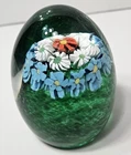 This listing includes a set of six vintage Murano flower glass paperweights featuring a swirl pattern and multicolored design. Handmade in the United States using art glass techniques, these decorative paperweights showcase the intricate craftsmanship of Murano glass. The glossy finish and incised backstamp add to the collectible value of these antique pieces, making them a unique addition to any pottery and glassware collection.