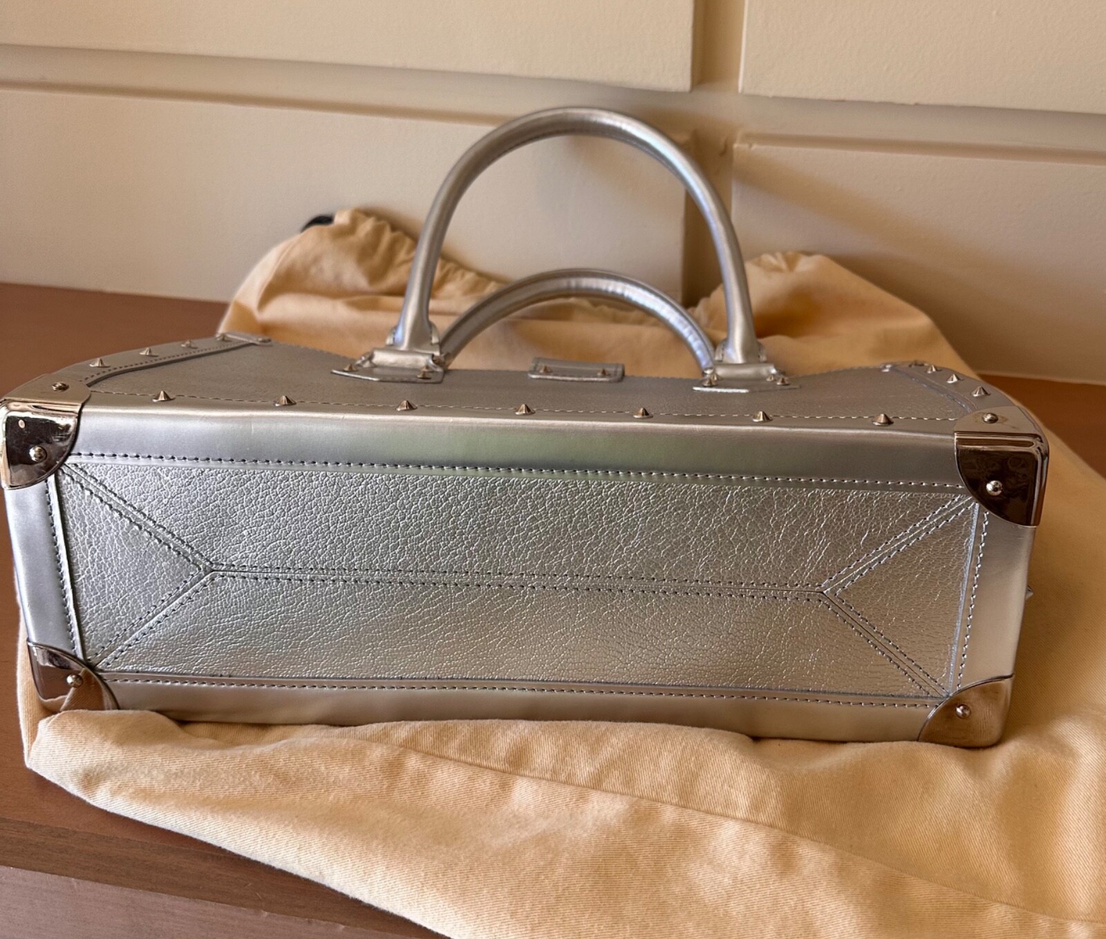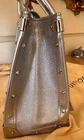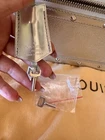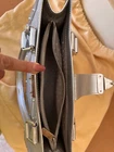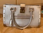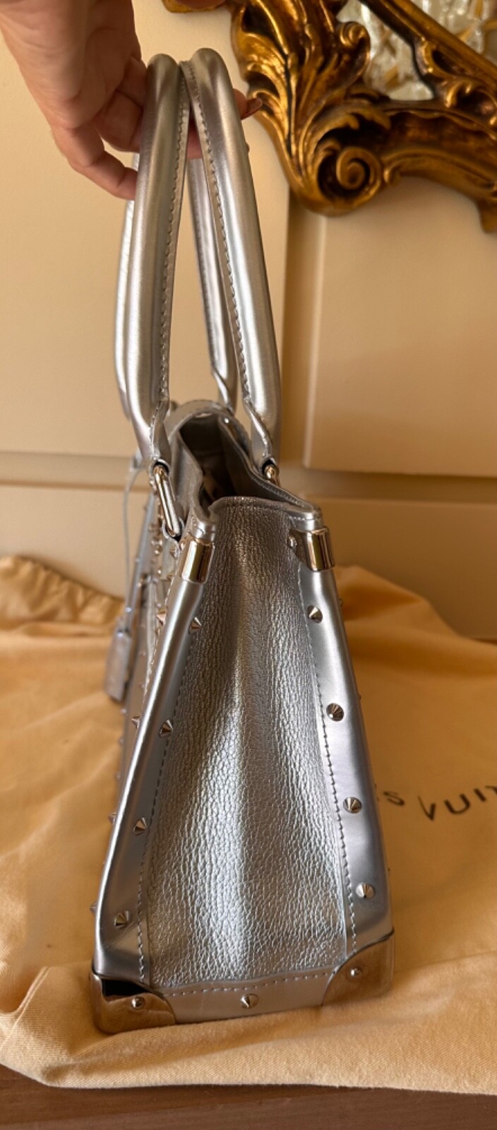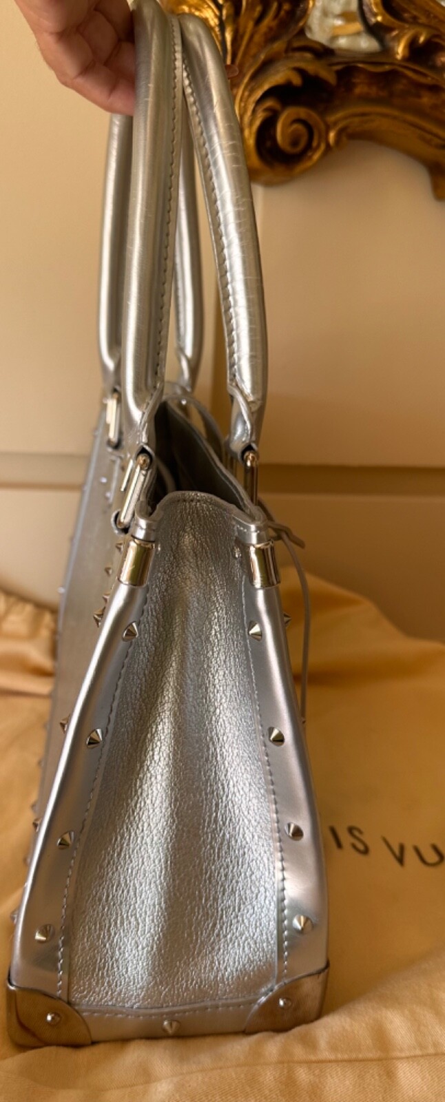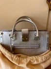 Pre owned like new . The silver color was very limited edition . Made out of goat skin leather . With silver studs and hardware . Rolled handles & dual shoulder straps. Studded accents and single exterior zip pocket. Logo jacquard lining with three interior pockets for easy access to a phone, lipstick etc. and a zip inside pocket that works as a wallet plus a key ring holder attached inside. for easy access to your keys. Protective feet at base. A gorgeous bag that really stands out . Pls look at pics the inside lining on Botton has a very small stain . Elevate your style game with this fabulous Louis Vuitton Le Fabuleux Bag . This medium-sized top handle bag features double handles with a handle drop of 20 inches, making it the perfect arm candy for any occasion. The clasp closure and silver hardware give it a sleek and sophisticated look. This vintage bag comes with a key holder, 2 keys, original box, and original dust bag, making it a must-have for any fashionista. The exterior is made of luxurious EPi leather, while the interior is lined with Jacquard in a beautiful silver color. The Louis Vuitton Fabulous product line is known for its exceptional quality and craftsmanship, and this bag is no exception. I take excellent care of my bags and they are always inside their dust bag and have never been put in the floor.
