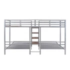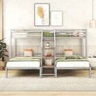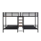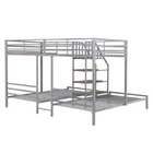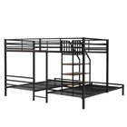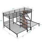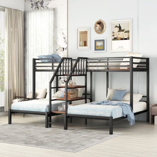 L-Shaped Triple Bunk Bed with Stairs, Metal Twin Over Twin & Twin Bunk Bed Features [Sturdy Metal Frame] Made of solid metal frame, the bunk bed is durable and reliable for you bedroom.Surrounding with high guardrail on upper bed, no need to worry about safety when sleep alone. [Space Saving Design] Three beds in one, while this bed provides a solution for multi-person accommodation, it also greatly saves space. [Multiple Storage Space] The 4-tier shelf is both a storage shelf and a staircase. The upper bed also comes with a 21.3" x 39" plank where you can put toys and more. Theres spacious space under the down beds. [No Box Spring Required] The slats support the mattresses not to slide and increase the service life. [Easy Assembly] All parts included in your package are indicated clearly. With step-by-step installation manual and per-drilled holes, you can easily assemble this bed individually. Manual installation is recommended. Description Metal Twin over Twin & Twin Bunk Bed, Triple Bunk Bed with Storage Shelves Staircase, Black This metal bunk bed features three beds in one, truly a space-saver. With a twin size bed on top and two twin size beds underneath, this bed is ideal for accommodating guests and sleepovers, and also perfect for family with multiple members. The staircase between beds is available for storage and the down bed is 10.4" off the floor, so there's spacious space under the down beds, you can use it to store your stuff. The top bed is equipped with full-length guardrail, keeping user's safe from falling. Coming with great quality and multiple function, this bed will be the best addition to your bedroom. Description Material Metal+MDF Size Twin Color Black Numbers of Package 2 Spring Box No need Assembly Required Yes Origin China Dimensions Overall Product Dimension 101.2''L x 77.4''W x 57.8''H Package Dimension Please refer to the Specification Upper Bed 76'' x 39'' Down Bed 75.2'' x 39.2'' Total Height 57.8'' Number of Bed Slats(Upper/Down) 22pcs/22pcs/22pcs Recommend Mattress Thickness of Bed(Upper/Down) 6''/8-10'' Overall Product Weight 180lb Bed Weight Capacity(Upper/Down) 300lb/300lb