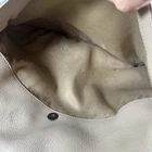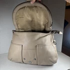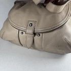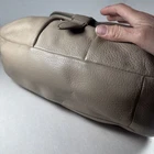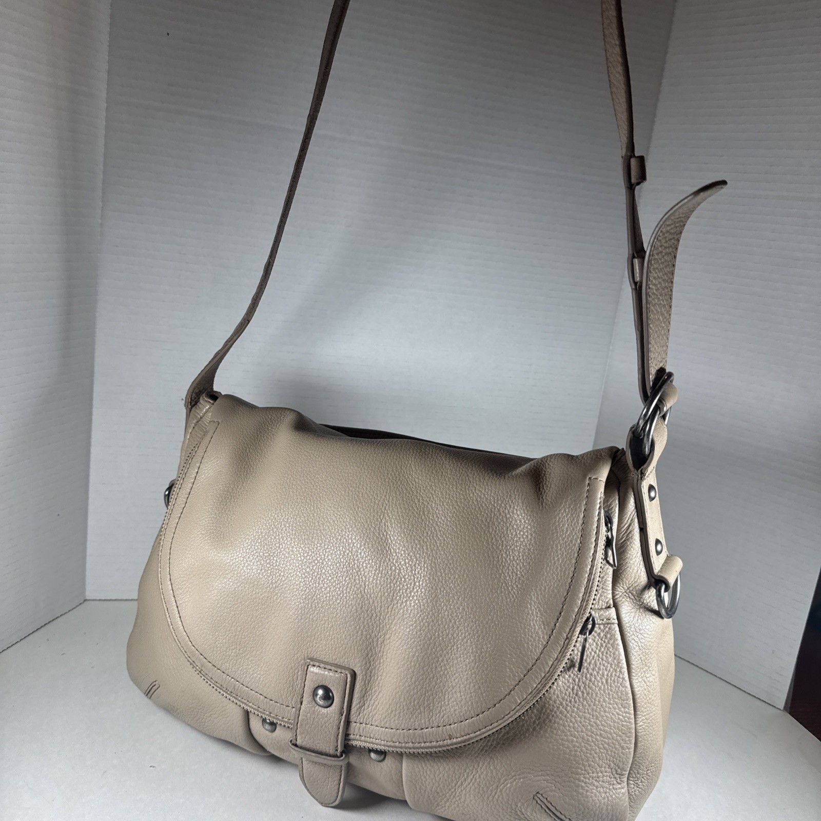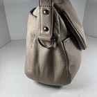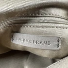 The LUCKY BRAND Taupe Nubuck Leather Hobo Shoulder Bag Purse is a stylish and spacious accessory for women. Made from high-quality leather with a pebbled finish, this large bag features a solid taupe exterior with a magnetic, flap, and snap closure. The stylish silver hardware adds a touch of sophistication to the design. The hobo style and messenger bag shape make it a perfect choice for everyday use, with a comfortable taupe leather handle/strap for easy carrying. This bag is ideal for those looking for a fashionable and functional handbag to complement their outfit. Inside could use a cleaning.