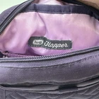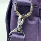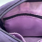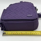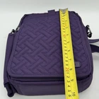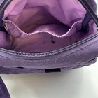 The LUG Flapper Quilted Travel Convertible Adjustable Crossbody Strap Bag in Purple is a stylish and functional small rectangular bag perfect for travel. The bag features a zip closure, gunmetal hardware accents, and a detachable crossbody strap with a purple handle. Made of durable polyester fabric with a quilted finish, this bag includes inner and bottle pockets for organization. It is a versatile option for active women looking for a convenient yet fashionable accessory for their travels. Inside show signs of gentle use. There is an ink spot on the inside bottom shown in photos.
