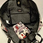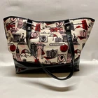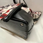 LULU by Lulu Guinness White Red Black London Print Bag Purse Tote With Pouch This ladies Tote is in good pre-owned condition with minimal signs of use. Please see all photos as this is the exact bag you will receive. Item features double handles, magnetic snap closure and bottom protective studs. It also includes the removable 6"x4" Pouch. Inside liner is clean and features an internal zip pocket. Measurements of bag are; 16" w, 10"h and 6" deep with a 9" handle drop. Item has a Sateen feel with Patent Leather trim. Same day shipping Thanks for looking!