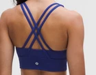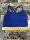 The Lululemon Energy Bra Longline in size 6 and Deep Sea Blue color is a stylish and functional sports bra perfect for active women. It features a pullover closure, crossback strap style, and medium support level, making it ideal for a variety of performance activities. Made from a blended fabric of nylon and spandex, this bra offers full cup coverage with removable pads for added comfort and breathability. The deep sea blue color adds a touch of vibrancy to your activewear collection, while the logo accents on the straps give it a sporty look. Machine washable for easy care, this bra from the Energy product line by Lululemon is a must-have for any woman's activewear wardrobe.
