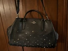 This Coach shoulder bag is a luxurious addition to any outfit. The black exterior is accented with studs and a moon theme, making it perfect for a night out. The bag is spacious enough to carry all your essentials and features a star and heart design. This bag is a must-have for any fashion-forward individual and is sure to turn heads. Ship to continental USA only.