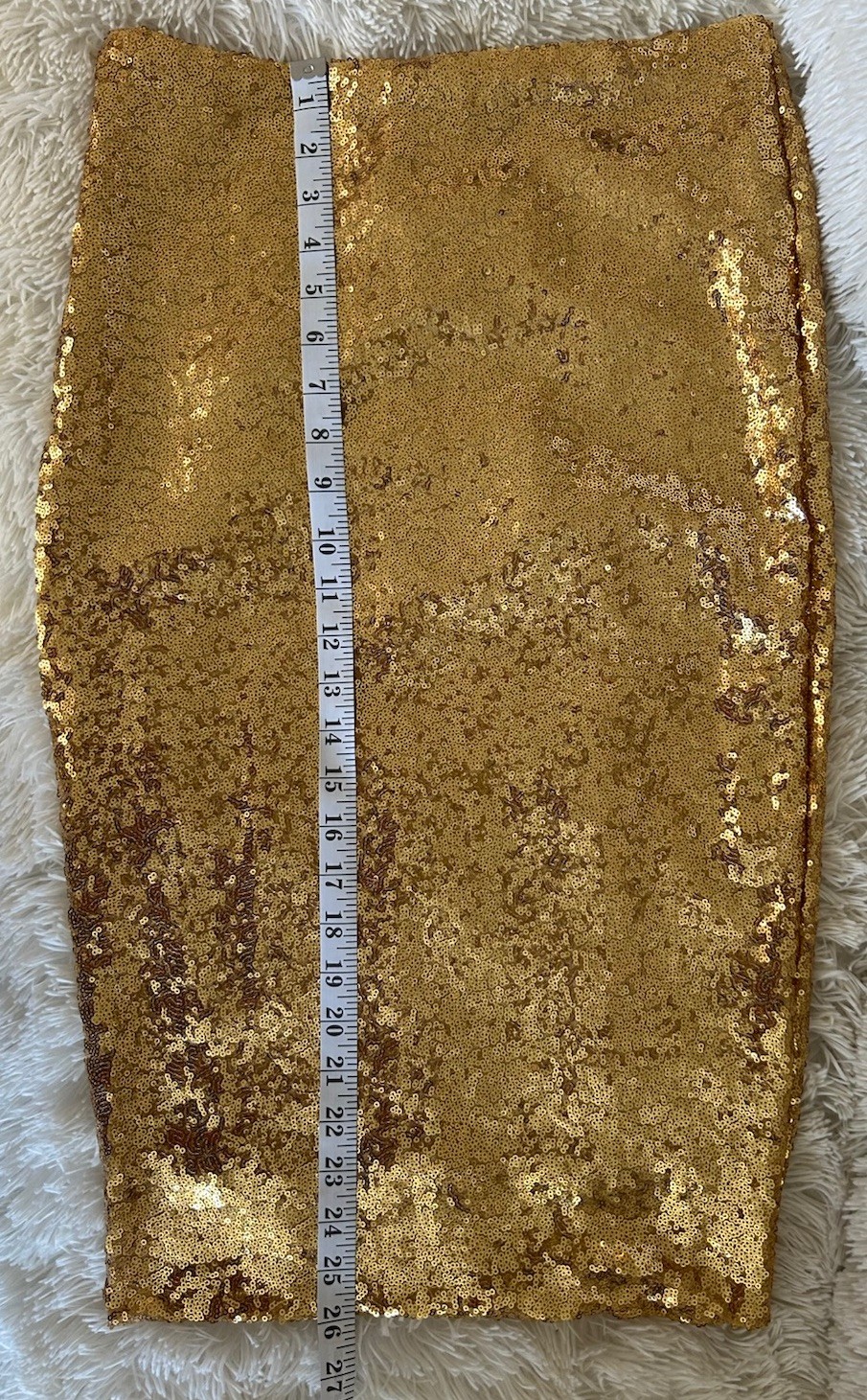 L'Vow Studio Knee Skirt All Over Gold Sequins NWT Holiday Stretch Glam Lg 26” Long This gorgeous skirt is new with tags. Please see photos for details. I use recycled materials in shipping whenever possible. Measurements are approximate. Smoke free home. Please let me know if you have any questions.