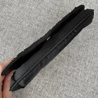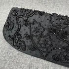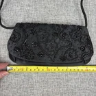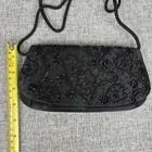 Small satin bag with fold over flap that has intricate black beading detail. Snap closure and long, black corded strap can be either tucked inside so you have a clutch, or use the strap to make it a shoulder bag or crossbody bag. Body of bag is padded with one interior slip pouch. SIZE: OS COLOR: Black MATERIAL CONTENT: Unknown STYLE: Clutch / Crossbody Bag COO: China CONDITION: Excellent pre-owned condition with no fading, stains, pilling, or holes/tears. All beads are present. Please see photos and video for details. FLAT MEASUREMENTS (approximate; see photos) Measures 4 inches tall by 8 inches long. Strap drop is 22 inches. If you have any questions, please don’t hesitate to ask. Thanks for viewing our listing! Classy, stylish, embellished, gala, party, wedding, special event, celebration, cocktails, floral beading, goth, vamp