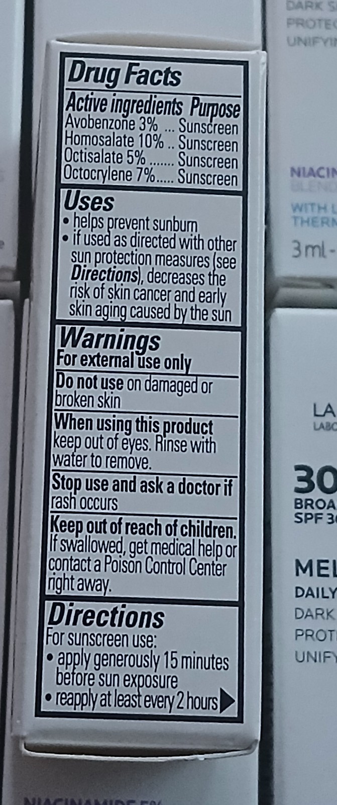 La Roche Posay MELA B3 UV Dark Spot Corrector 5% Niacinamide 0.1oz / 3mL SPF 30 Broad spectrum, daily sunscreen, and dark spot corrector. Blends on all skin tones, with LA ROCHE-POSAY THERMAL SPRING WATER. Made in France. 3ml Mini bottle, perfect for your purse. You receive the same Moisturizer shown, factory sealed. Ships quick by the next business day.
