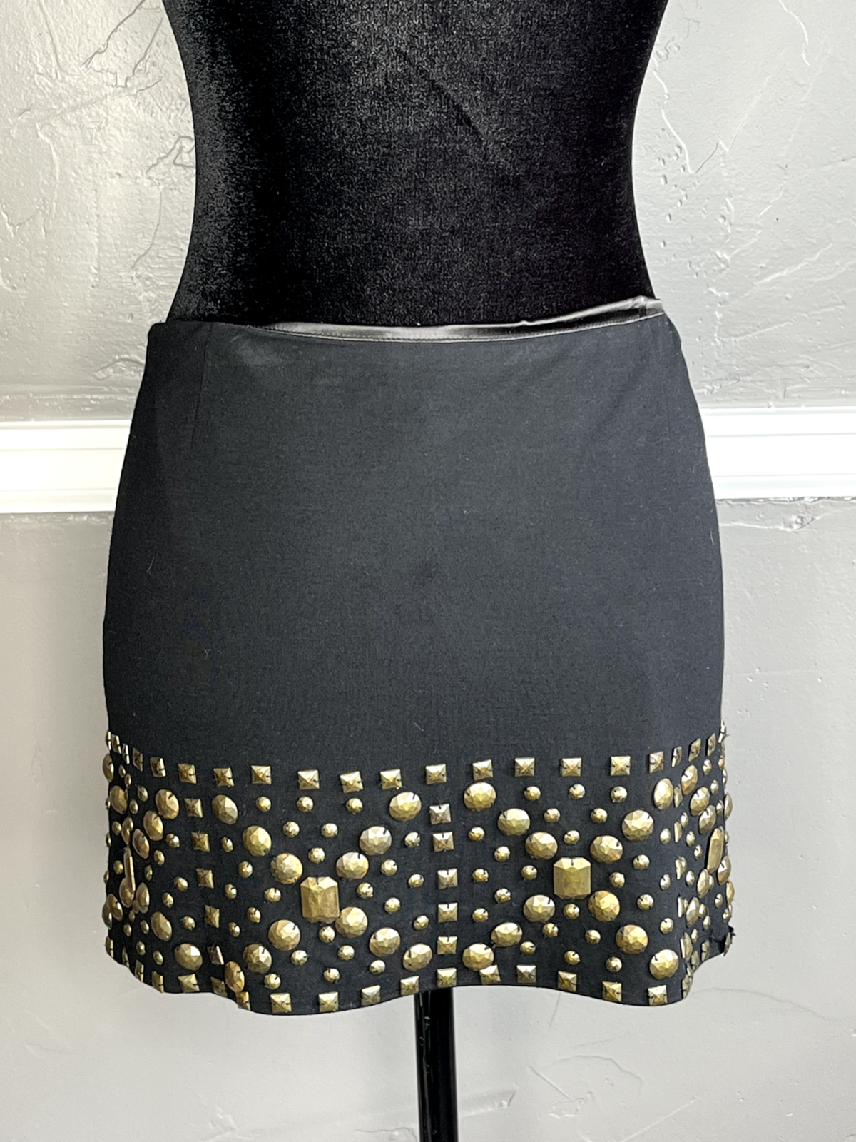 LaROK Women's Black Mini Skirt with Studs Skirt is lined with zipper on the left side Size: 8 Color: Black Good Used Condition Waist: 32" Length: 13.5" 67% Rayon, 29% Polyester, 4% Spandex Lining: 95% Polyester 5% Spandex Hand Wash Cold Comes from smoke free home